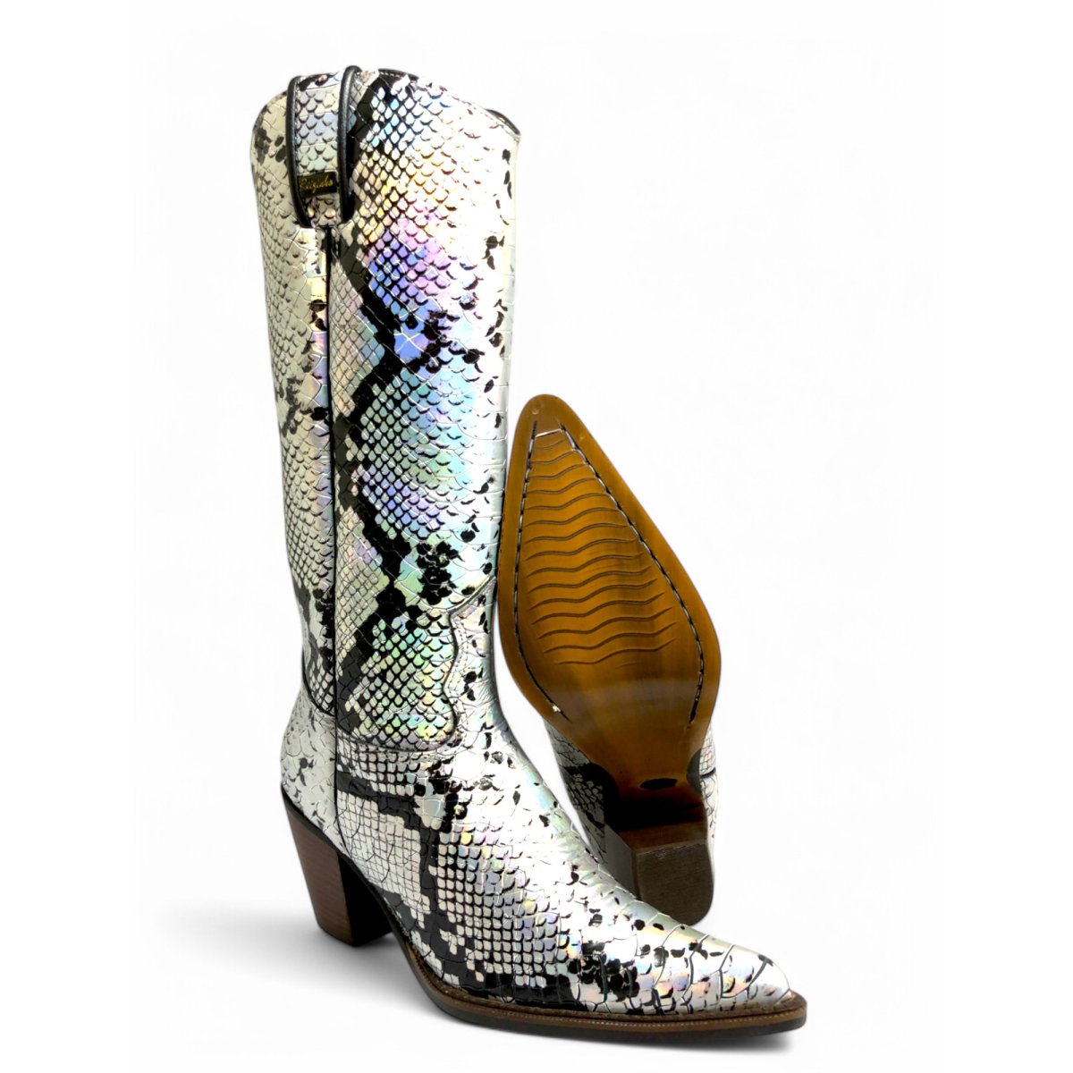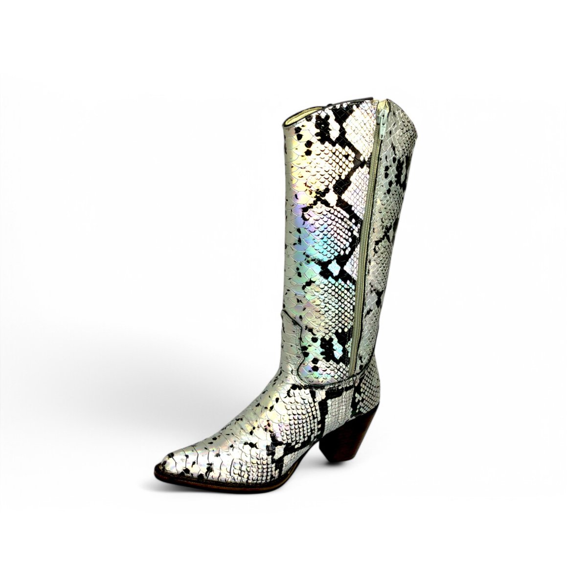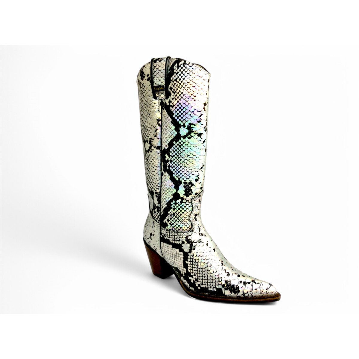 Bota Texana Feminina de Couro Bovino Imitação de Cobra Natural Prateada - Cano Alto, Bico Fino | Reizinho Botas