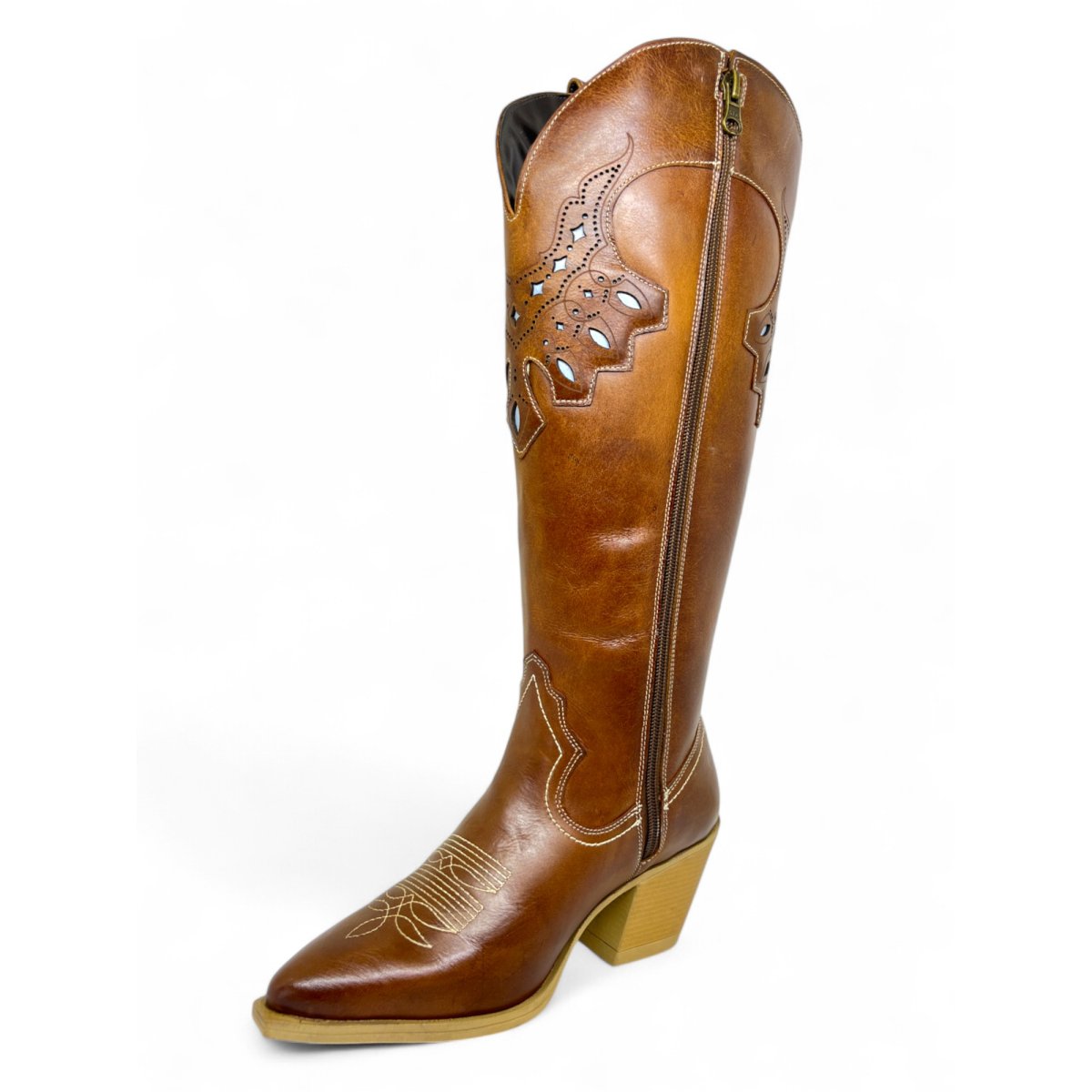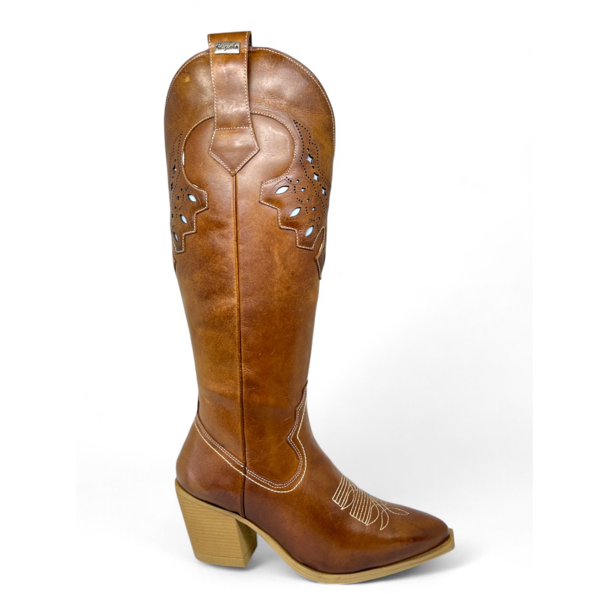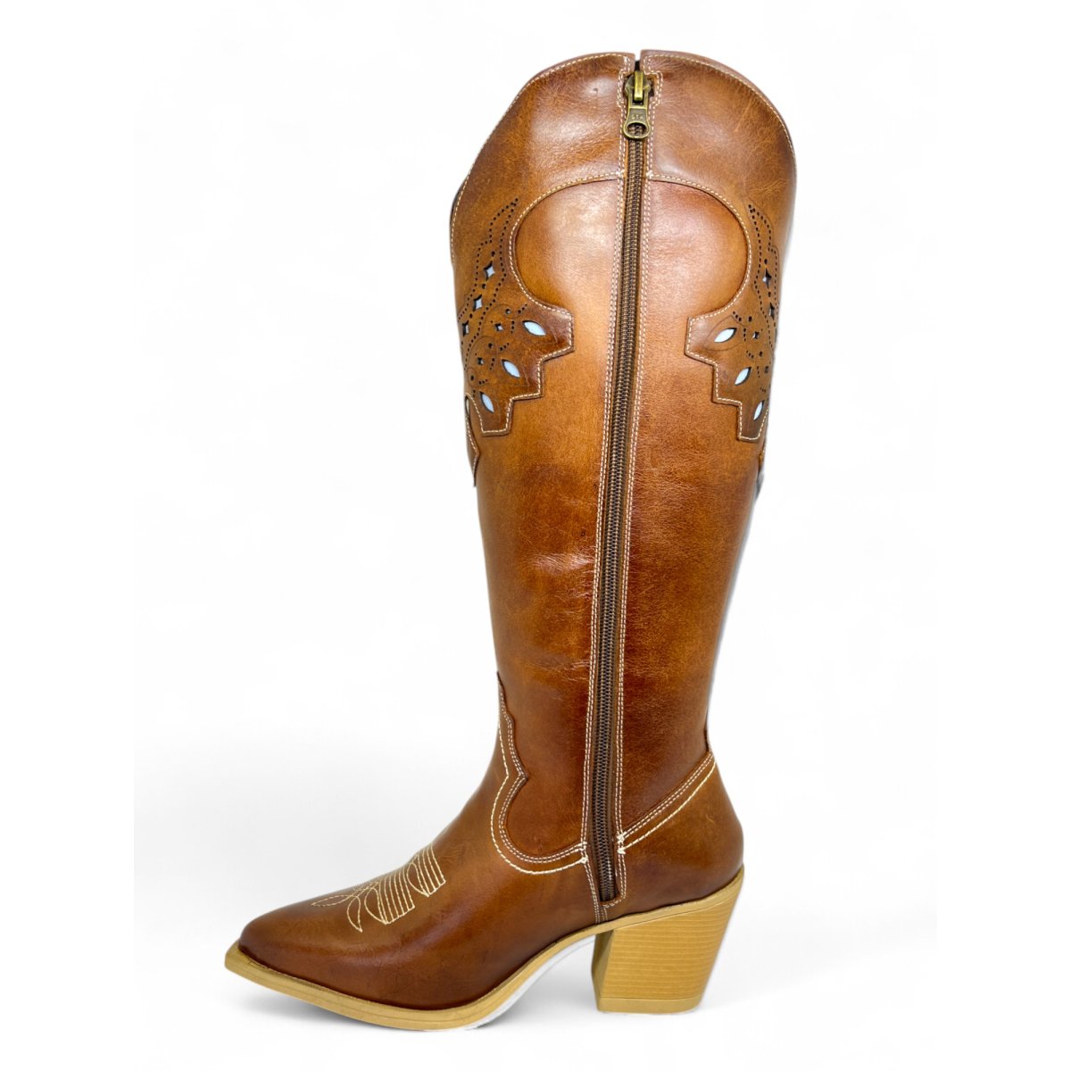 Bota Texana Feminina de Couro Bovino Marrom Havana - Cano Alto, Bico Fino | Reizinho Botas