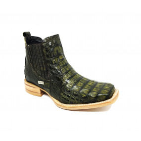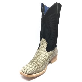 O couro de jacaré utilizado no pé da bota destaca-se por sua tonalidade tabaco, um marrom claro que exala elegância e distinção. Conhecido por sua textura única e relevos naturais pronunciados, o couro de jacaré é altamente valorizado no mundo da moda por sua raridade e aparência exótica. A demanda por produtos confeccionados com este material tem crescido significativamente, especialmente entre consumidores que buscam peças exclusivas e de alto padrão.