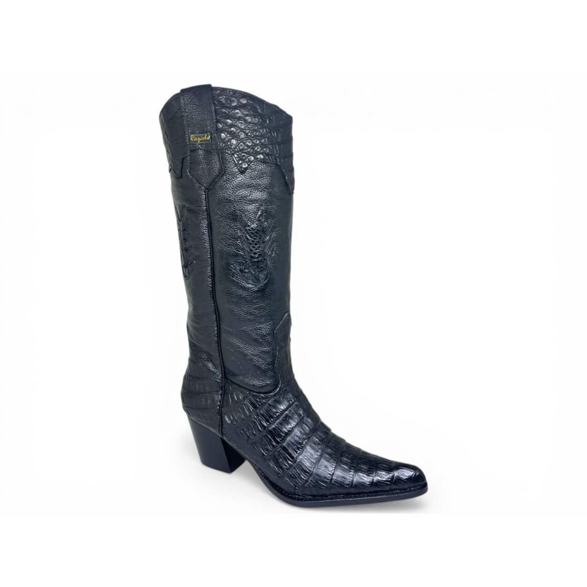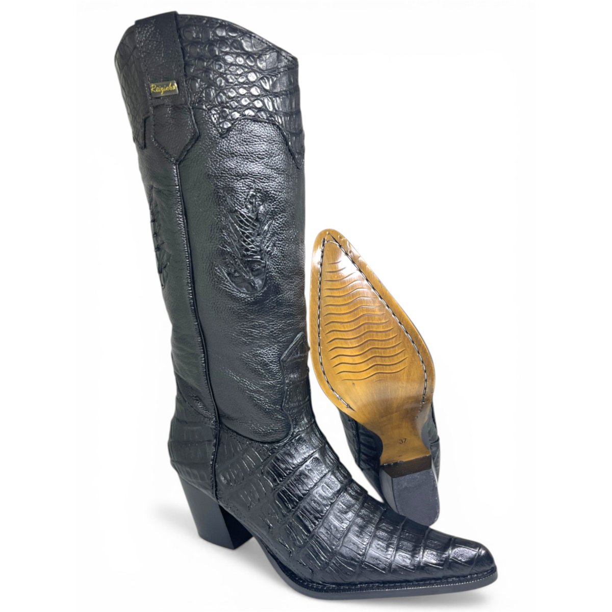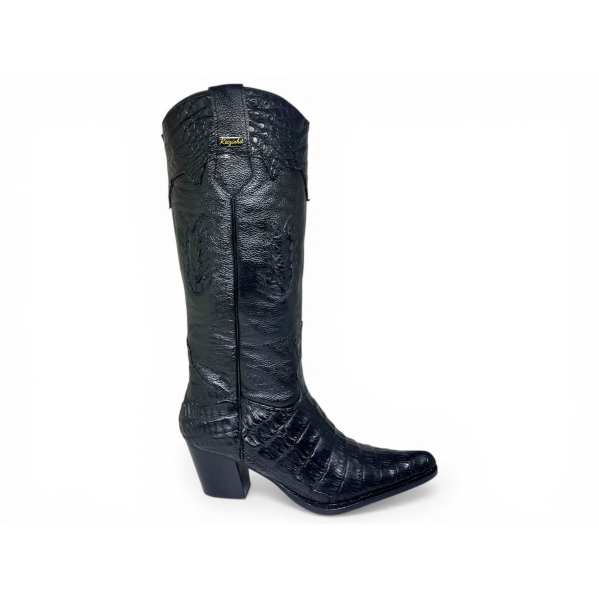 Bota Texana Feminina de Couro Legítimo de Jacaré Preto - Cano Alto, Bico Fino | Reizinho Botas