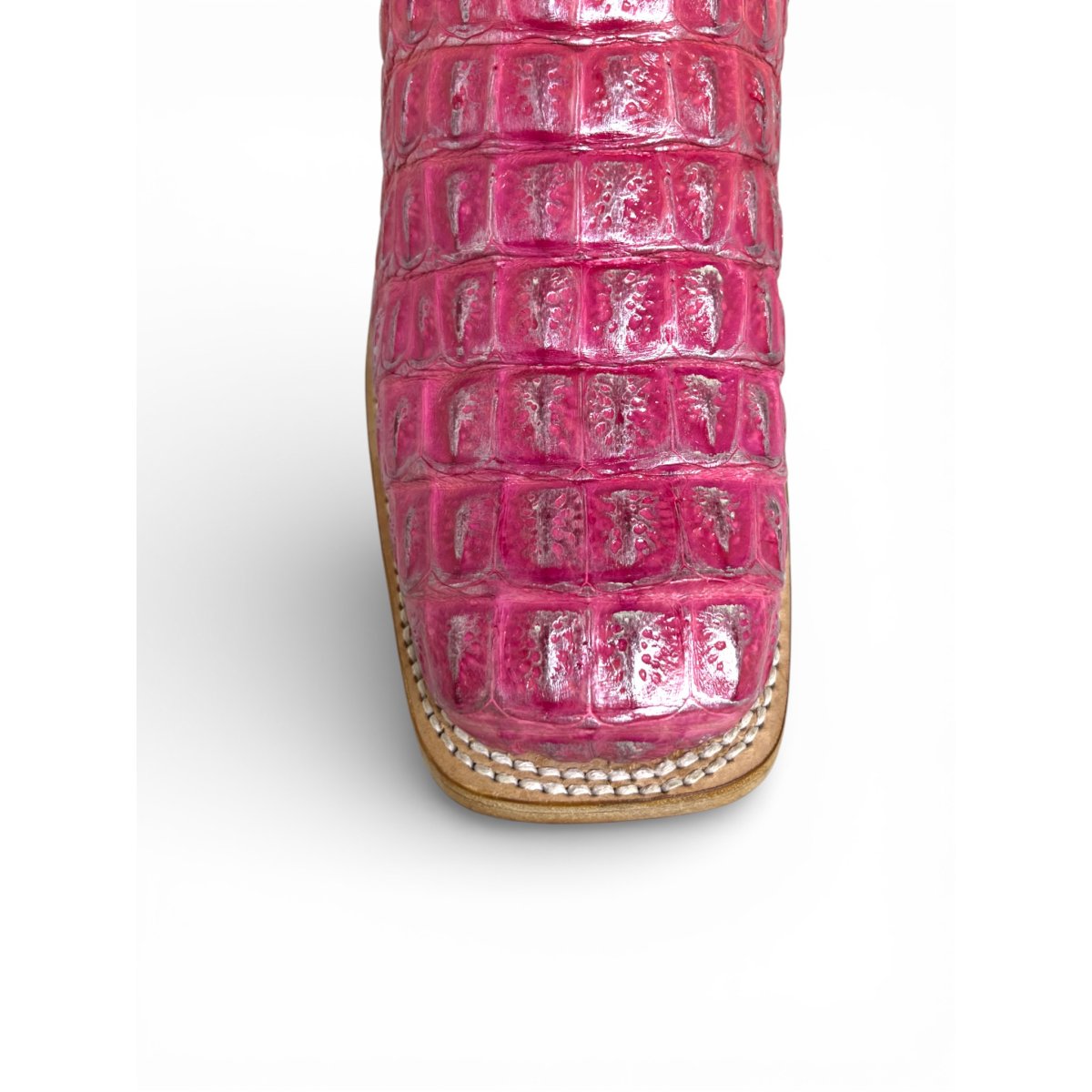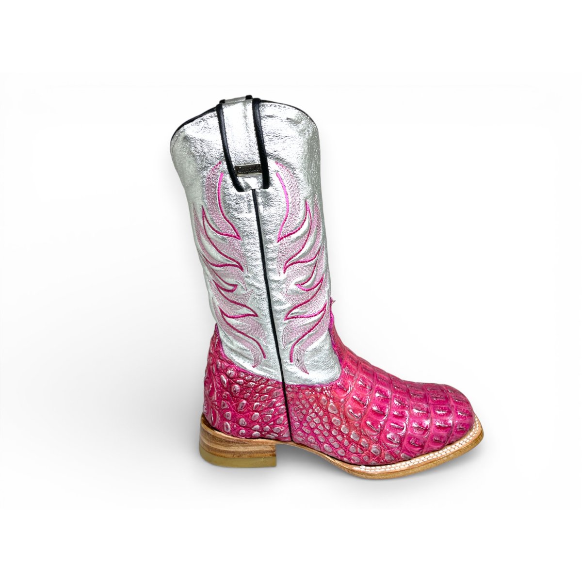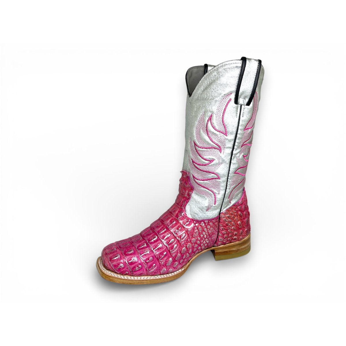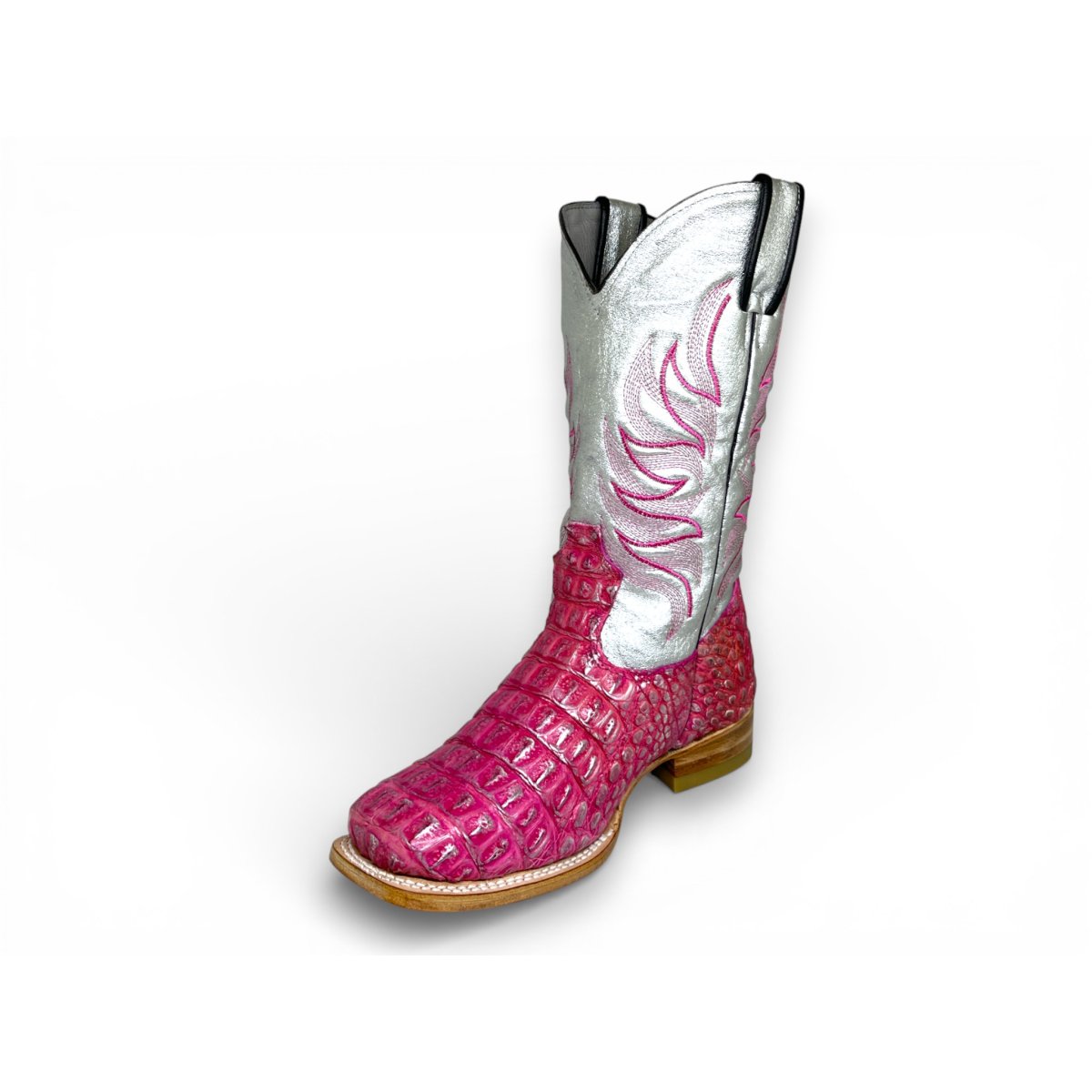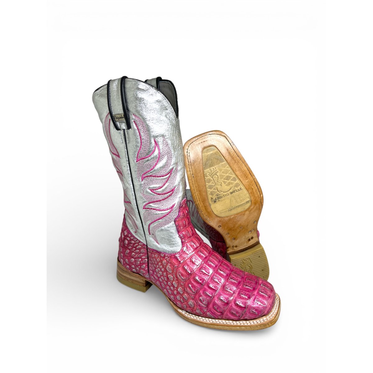 Bota Texana Reizinho Premium de Jacaré Silver Pink - Cano Alto, Bico Quadrado - Solado de Couro Artesanal Injetado | Reizinho Botas