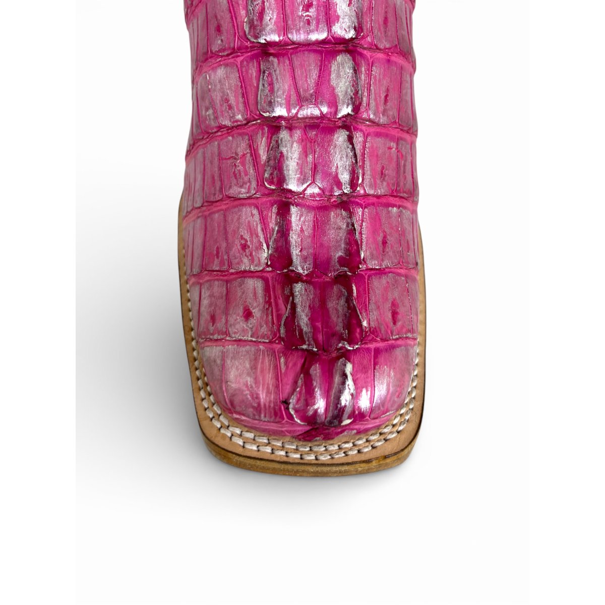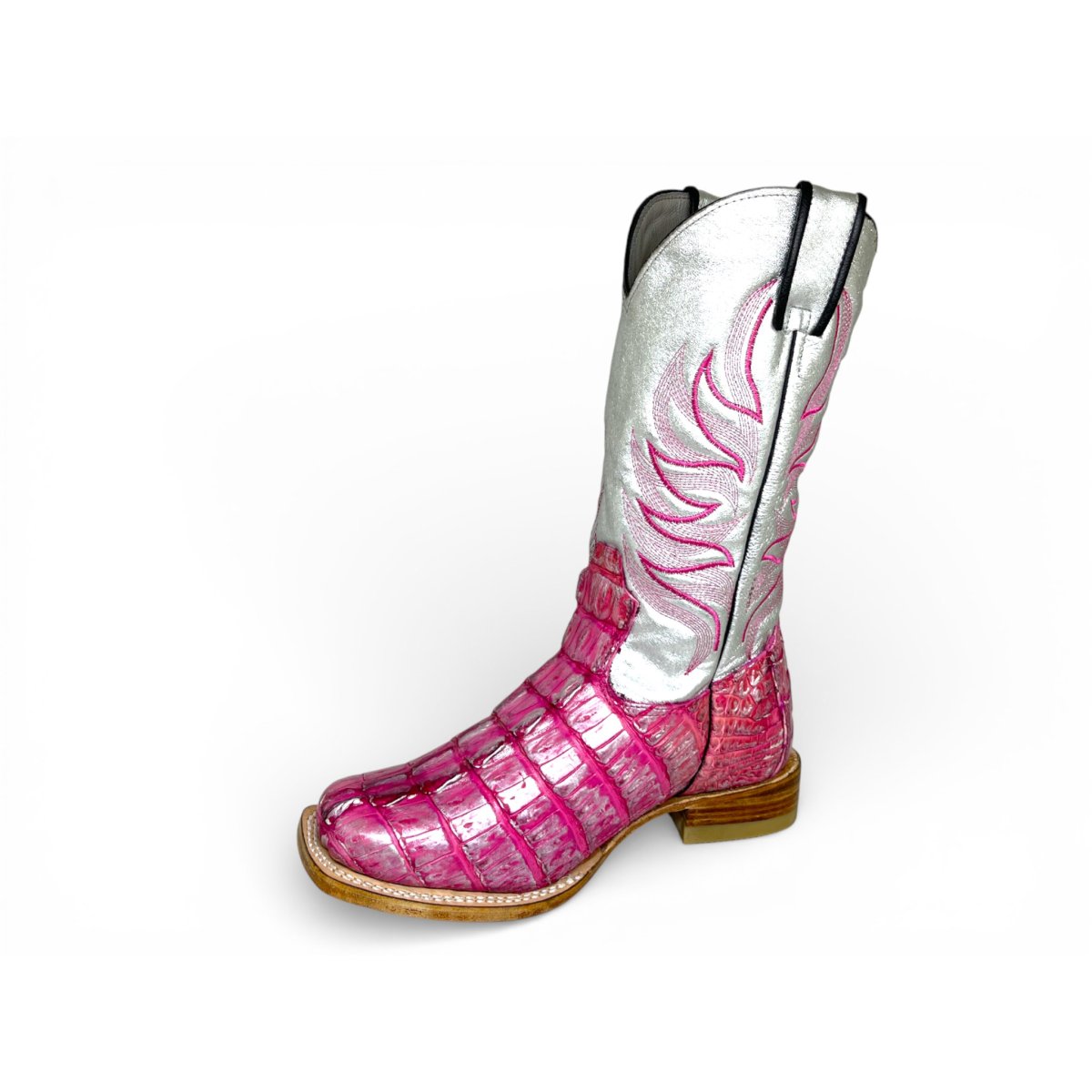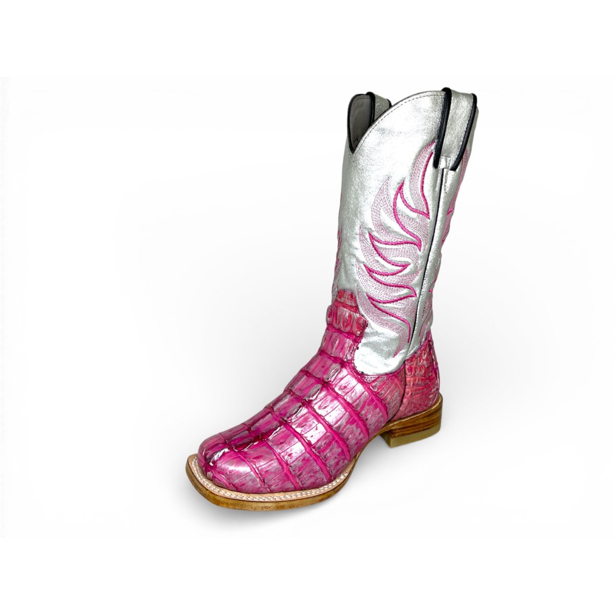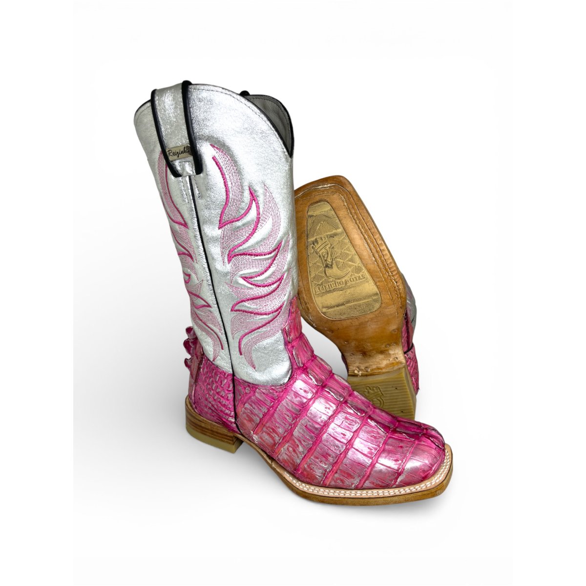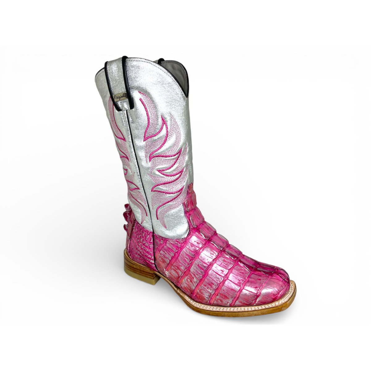 Bota Texana Reizinho Premium de Jacaré Silver Pink Rabo - Cano Alto, Bico Quadrado - Solado de Couro Artesanal Injetado | Reizinho Botas