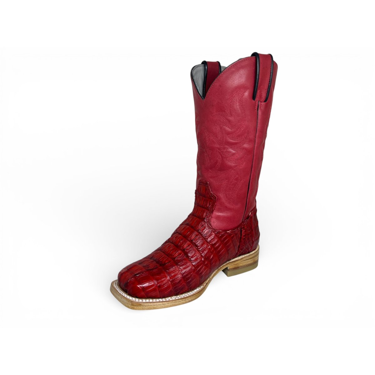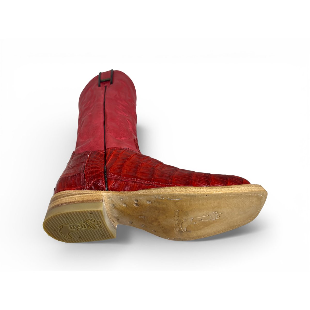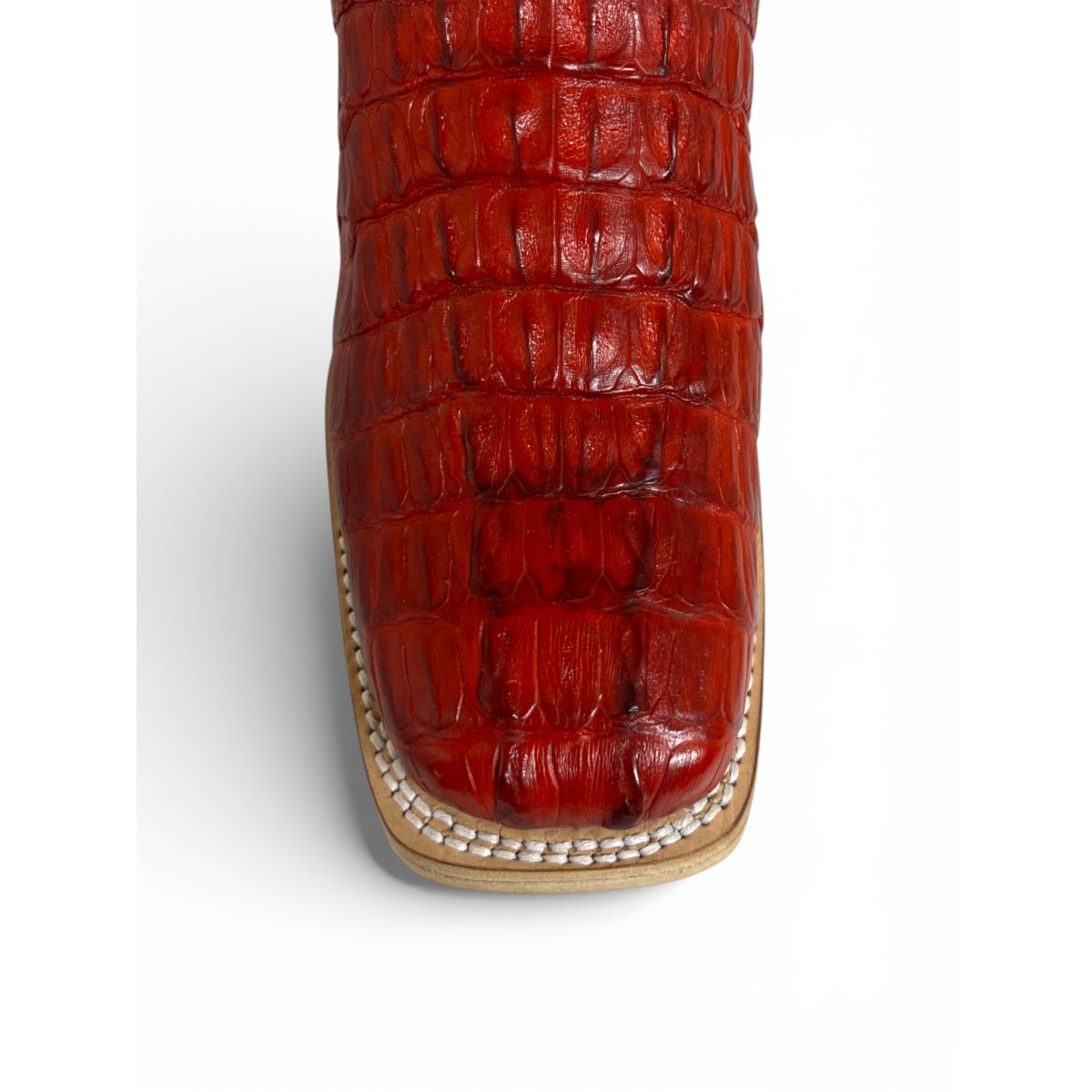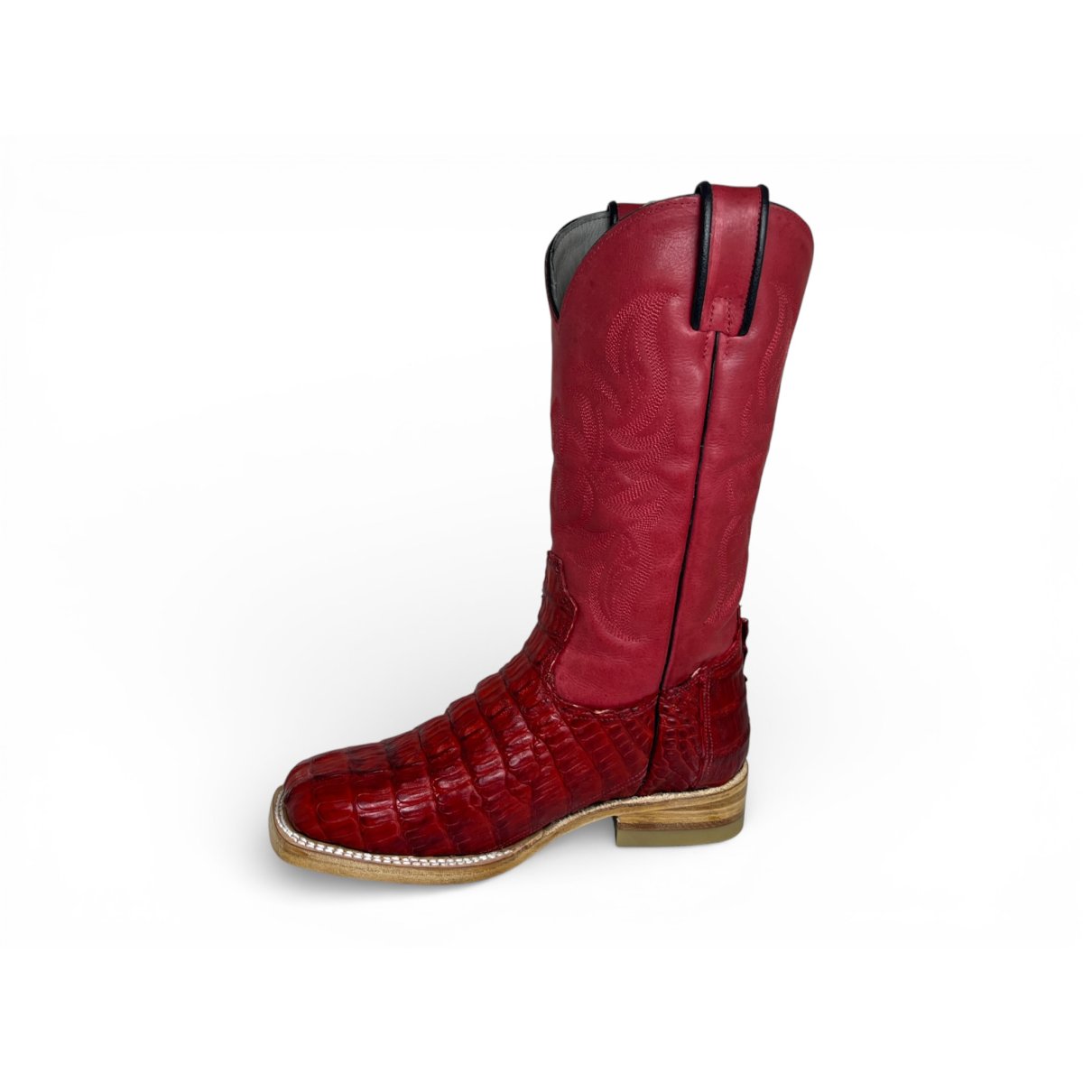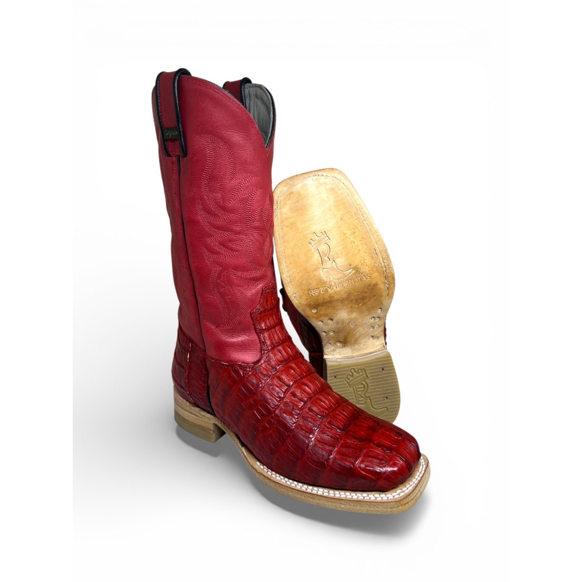 Bota Texana Reizinho Premium de Jacaré Vermelho Escuro Rabo - Cano Alto, Bico Quadrado - Solado de Couro Artesanal | Reizinho Botas
