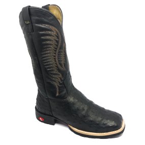 Bota de Avestruz Cheio Black Cognac - Cano Alto, Bico Quadrado, Solado S-Flex Artesanal