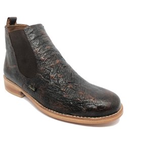 Tem o salto feito em couro com capa de borracha e acabamento colado e pregado com a sola de borracha e soleta de couro costurada e ponteada na frente.
