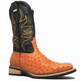 Bota De Couro Avestruz Cheio Laranja - Cano Médio, Bico Fino, SOLADO DE COURO ARTESANAL