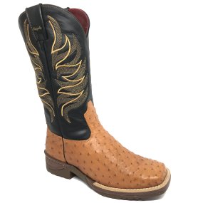 Bota de Couro de Avestruz Cheio Black Cognac - Cano Médio, Bico Quadrado, SOLADO X-FLEX ARTESANAL