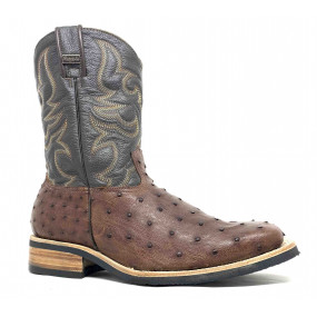 Bota de Couro de Avestruz Cheio Conhaque - Cano Alto, Bico Quadrado, Solado Flex Comfort