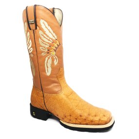 Bota de Couro de Avestruz Cheio Pinhão - Cano Alto, Bico Quadrado, SOLADO X-FLEX ARTESANAL