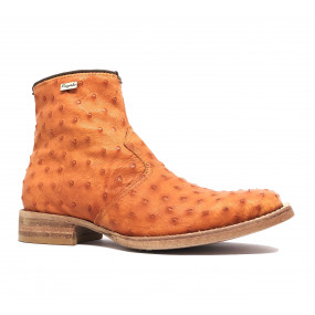 Bota de Couro de Barriga de Avestruz Black Cognac - Cano Curto de Elástico, Bico Quadrado, Solado de Couro Artesanal