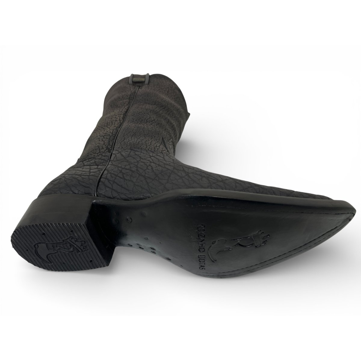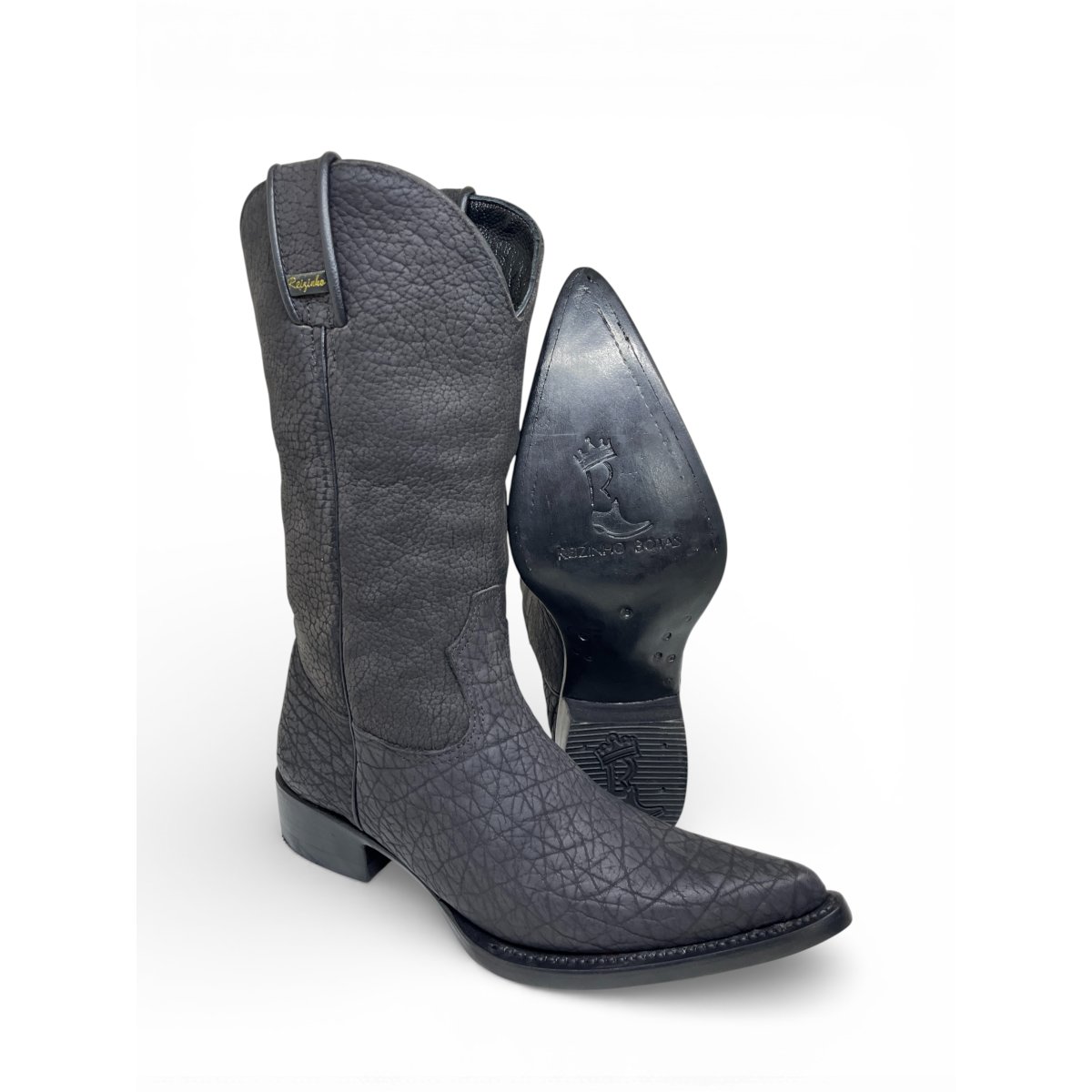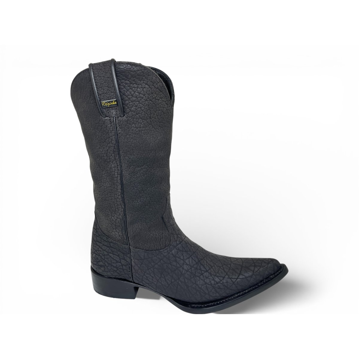 Bota Texana Reizinho Premium Inteira de Couro Legítimo de Bisão Preto - Cano Alto, Bico Fino Arredondado - Solado de Couro Artesanal | Reizinho Botas