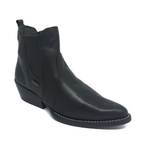 Tem o salto feito em couro com capa de borracha e acabamento colado e pregado com a sola e soleta de couro costurada e ponteada na frente.