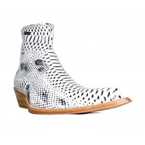 Bota de Couro Bovino Imitação de Cobra Verniz Preta- Cano Alto, Bico Fino, SOLADO DE COURO ARTESANAL