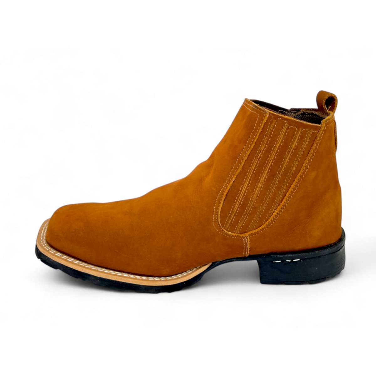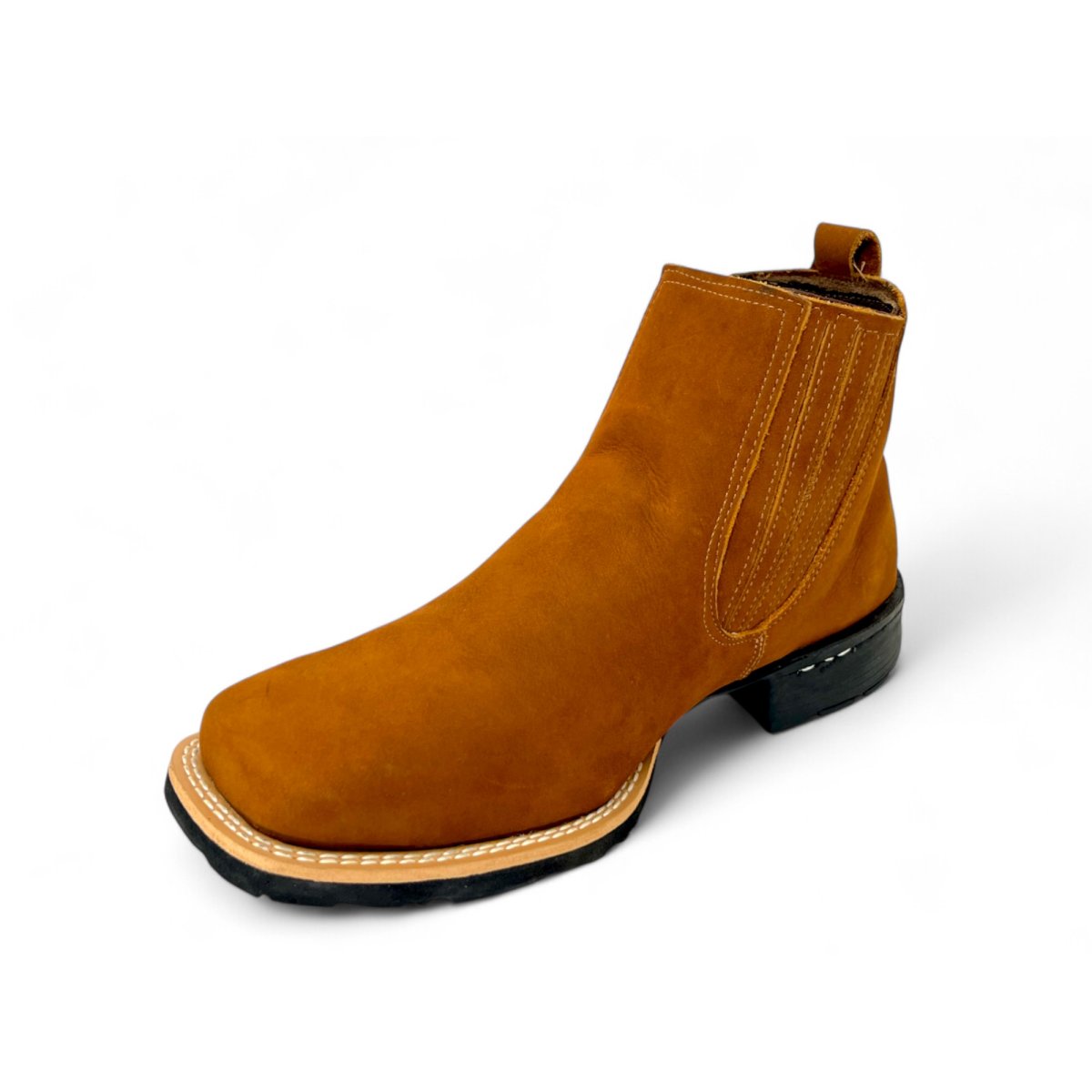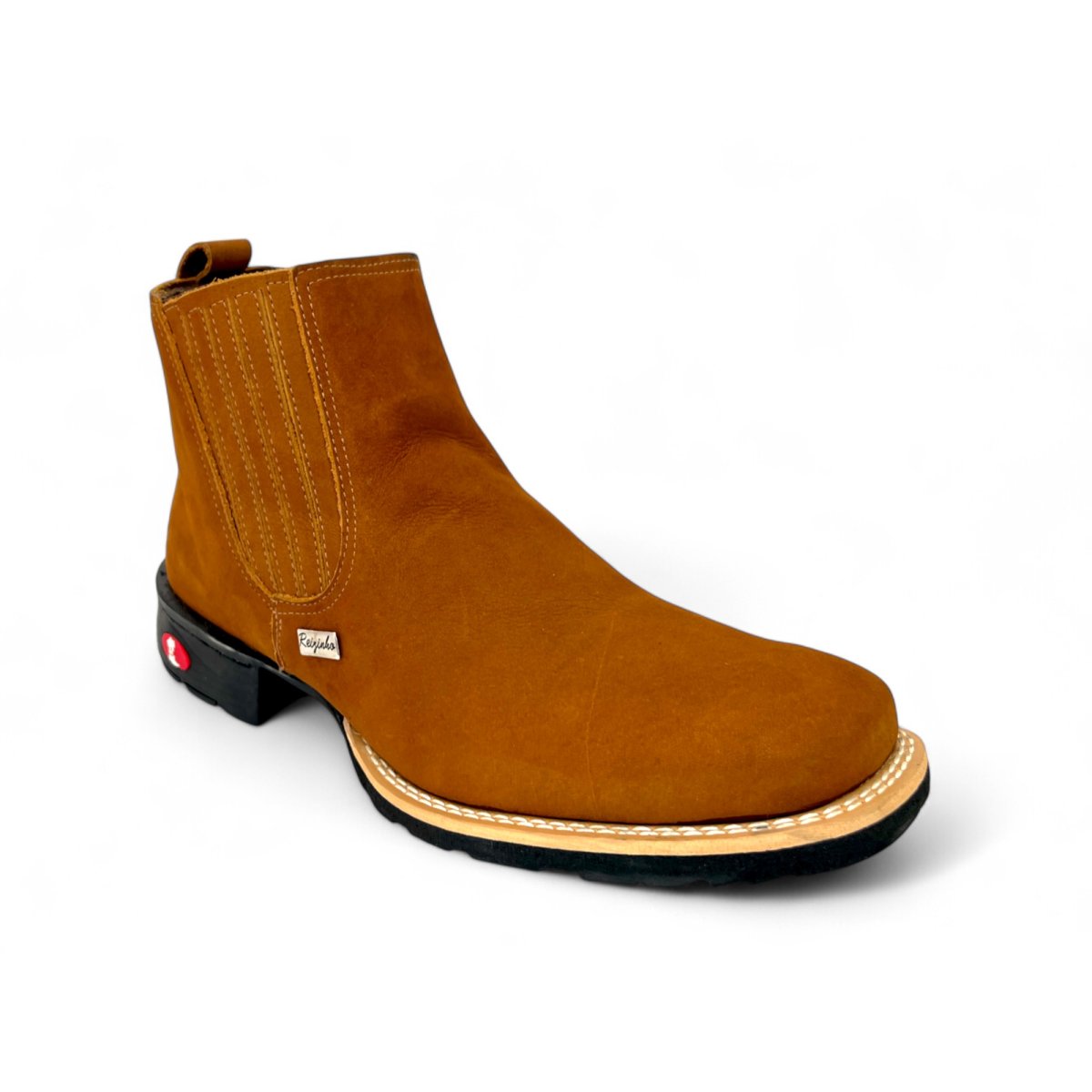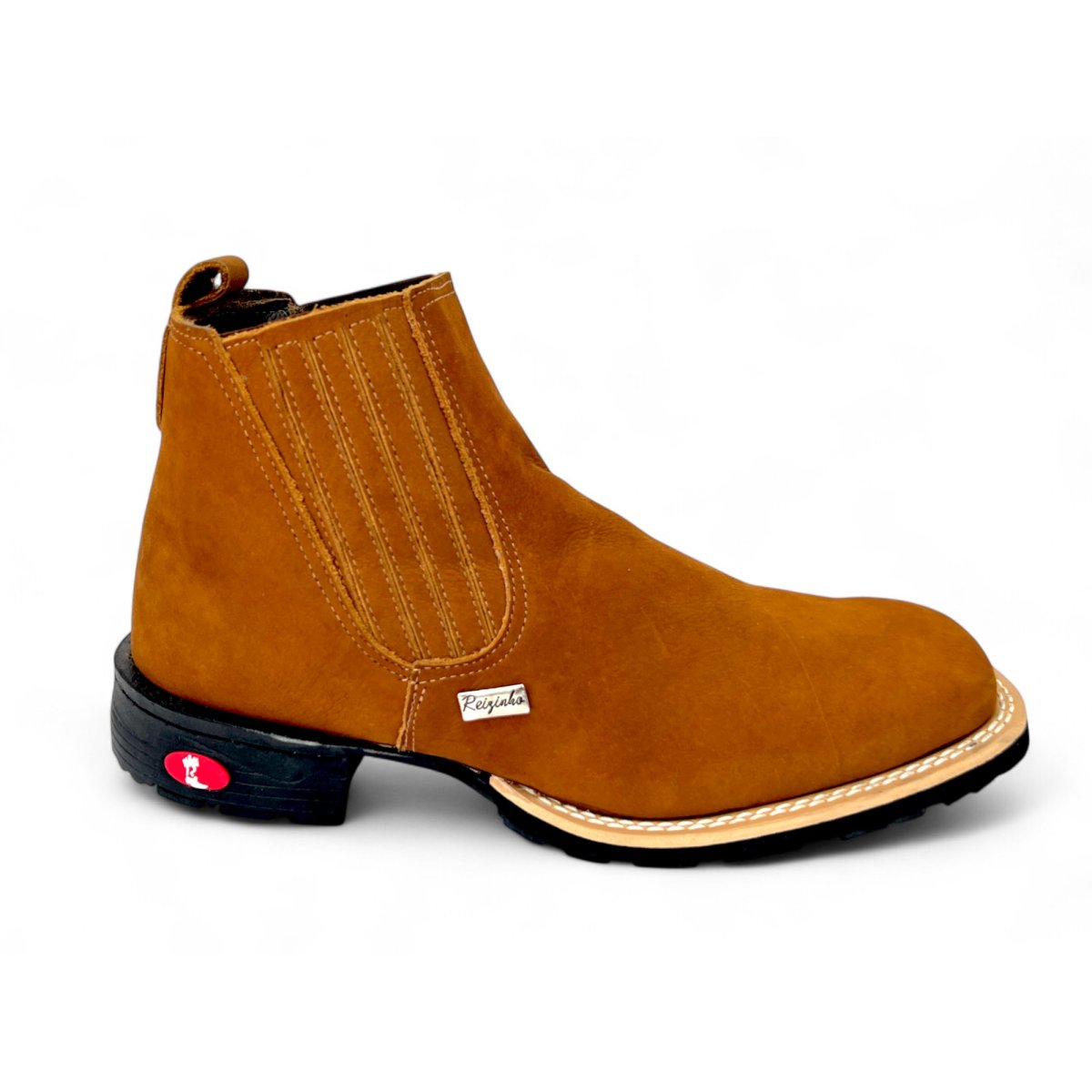 Bota Texana De Couro Bovino Bufalado Caramelo - Cano Curto Elástico, Bico Quadrado - Solado Flex Comfort | Reizinho Botas