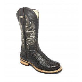 Bota de Couro de Jacaré Preto Rabo - Cano Alto, Bico Quadrado, SOLADO DE COURO ARTESANAL