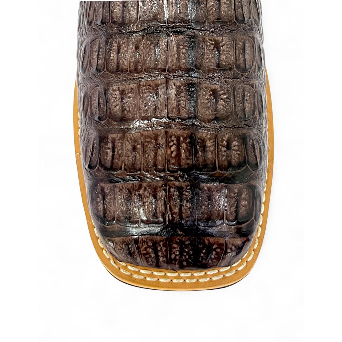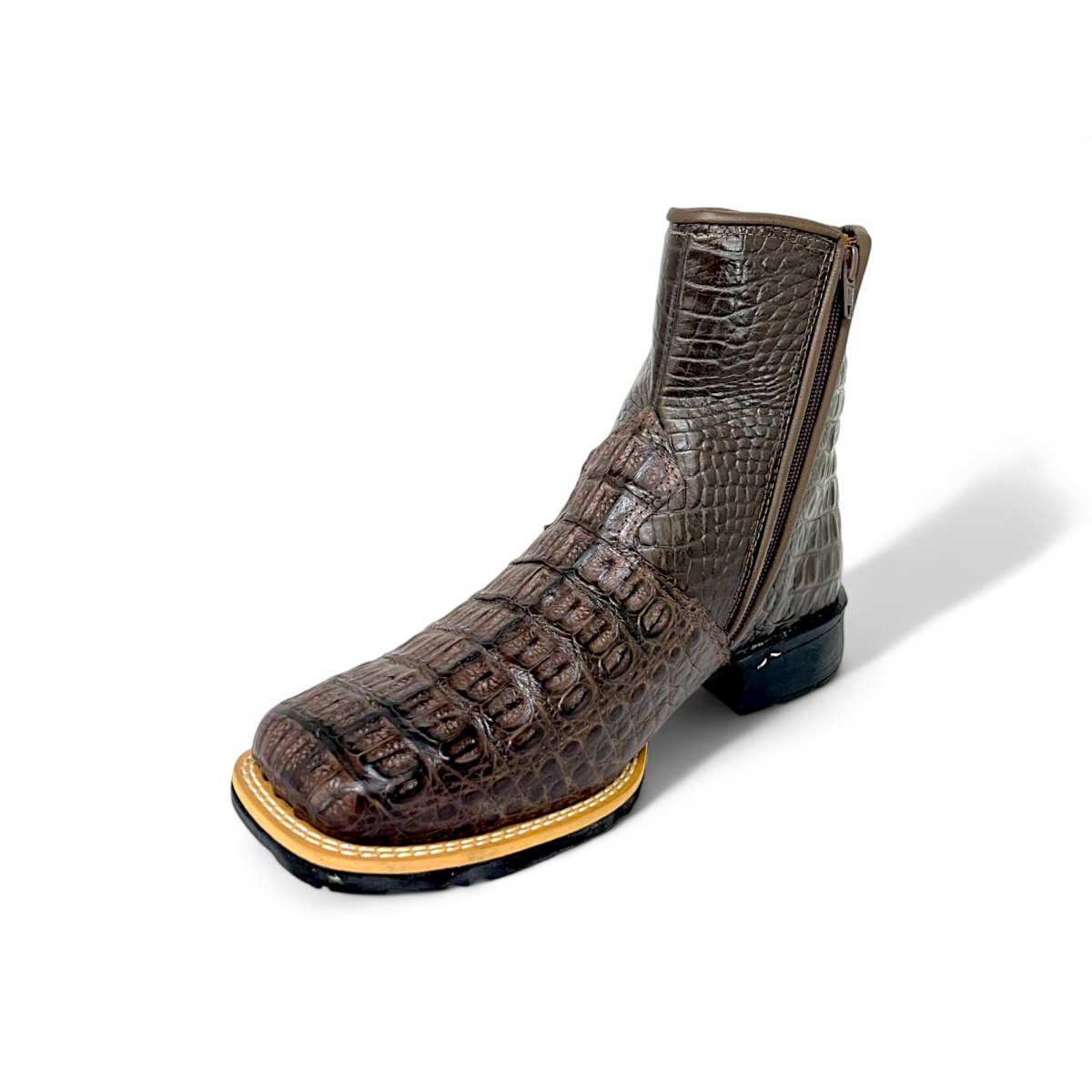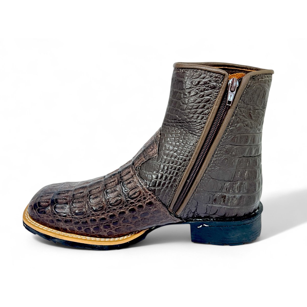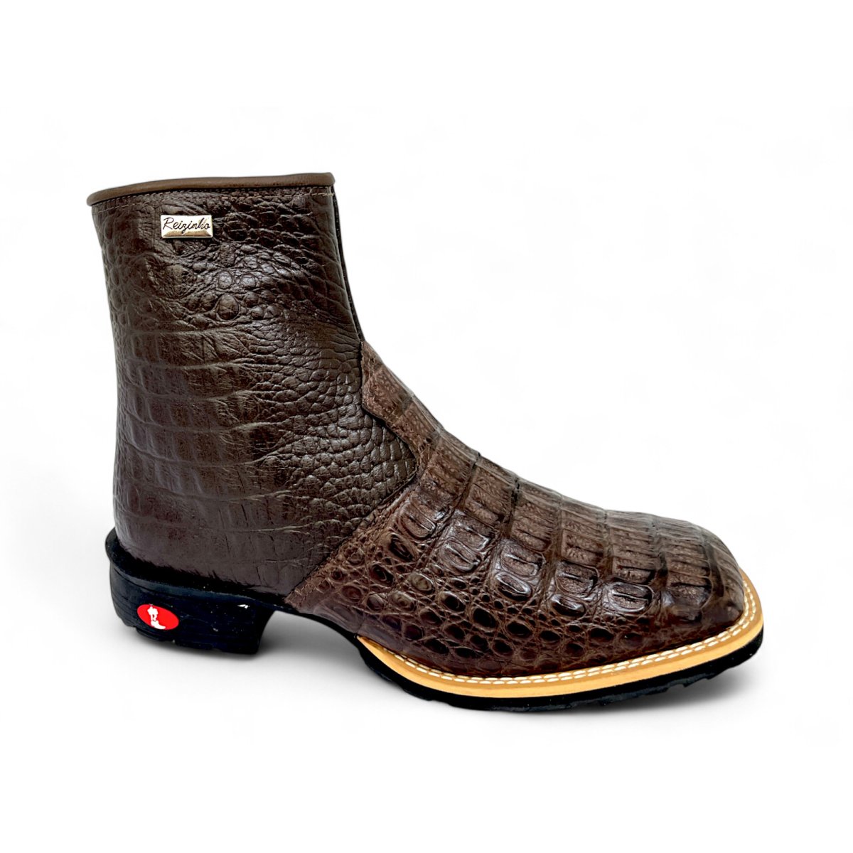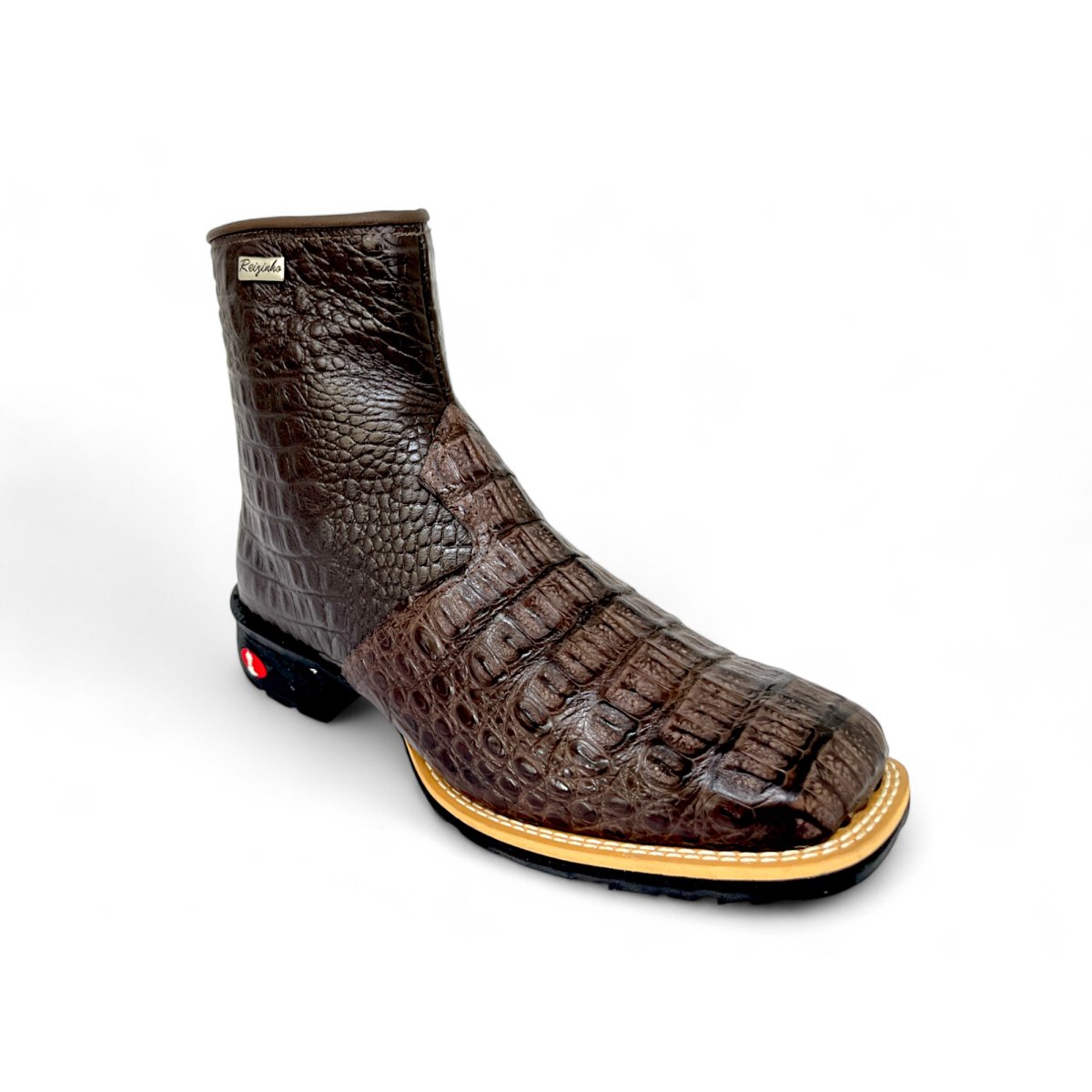 Bota Texana De Couro de Jacaré Tabaco - Cano Curto Zíper, Bico Quadrado - Solado Flex Comfort | Reizinho Botas