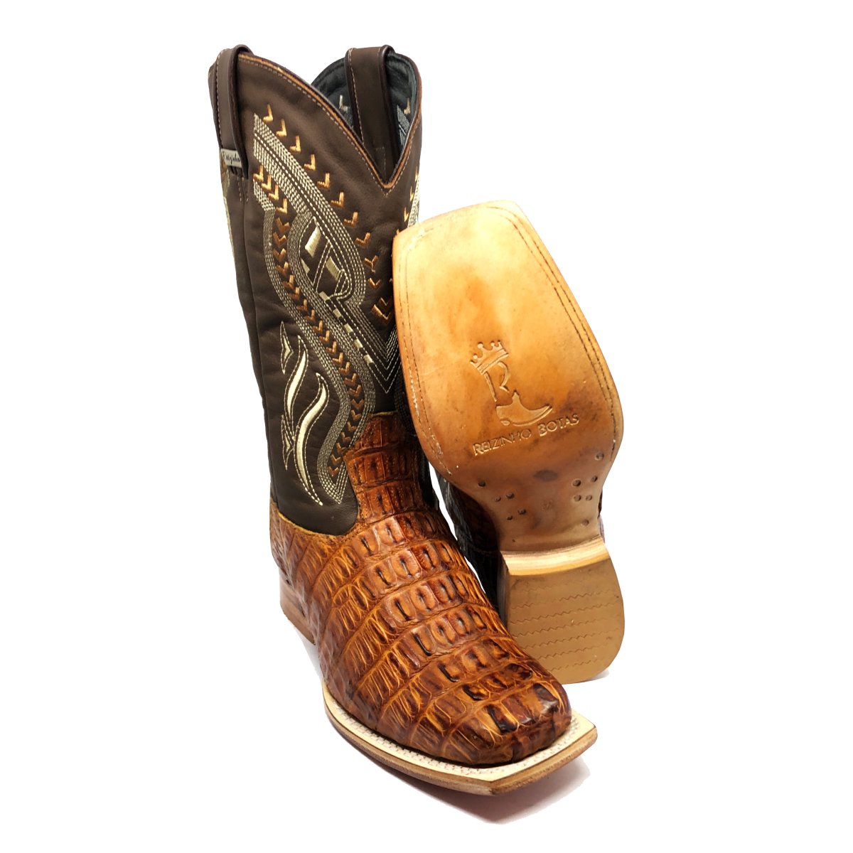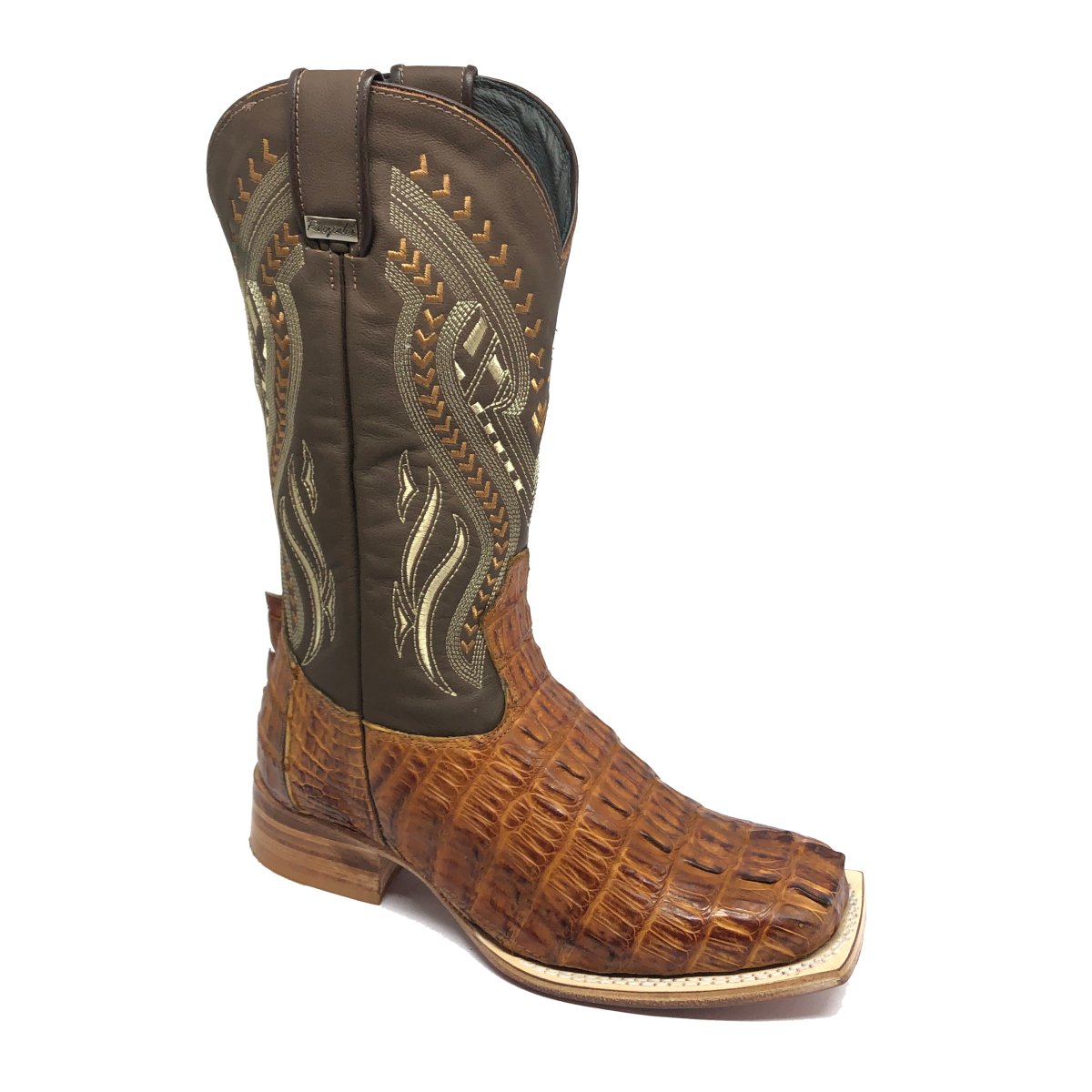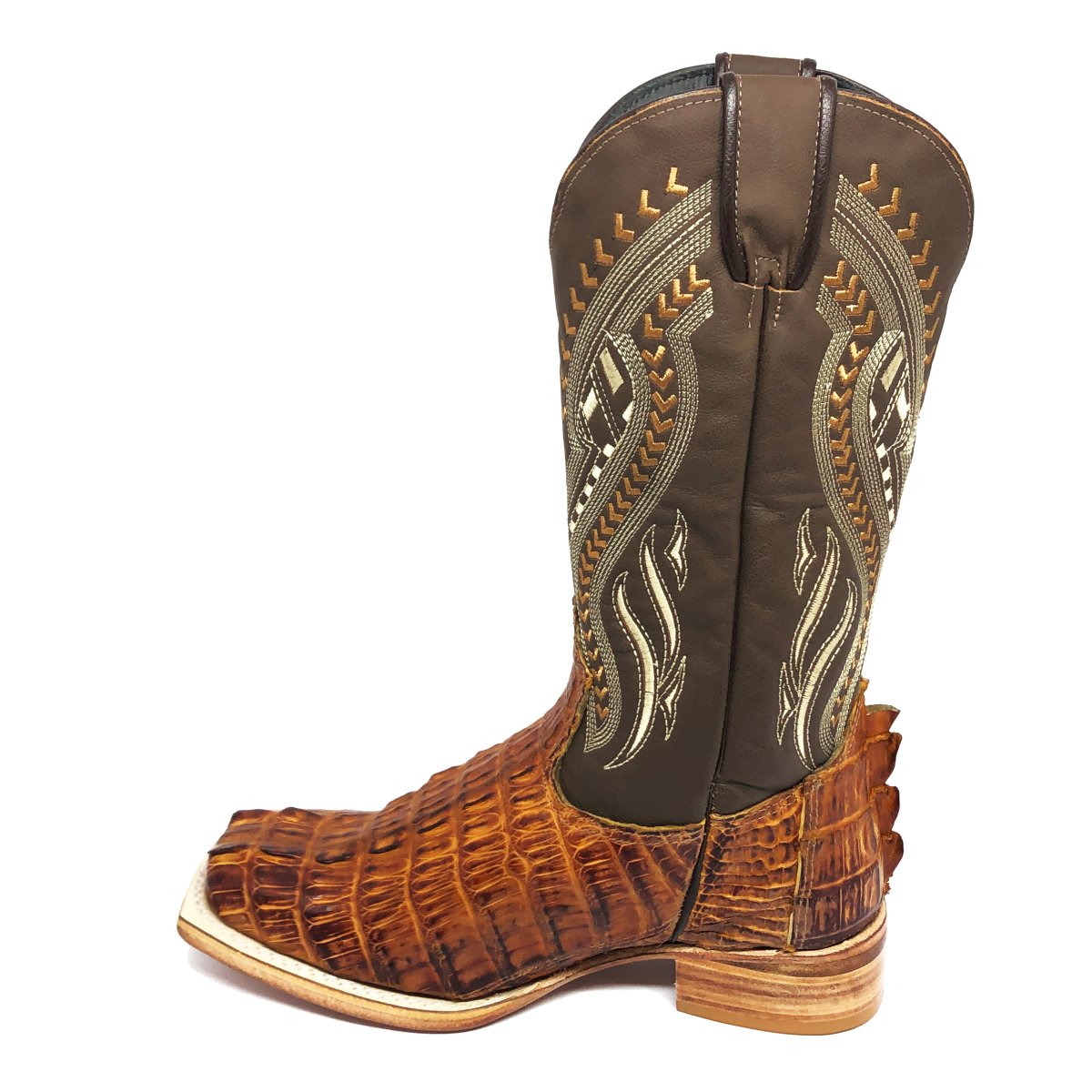 Bota Texana de Couro Legítimo de Jacaré Havana Escuro Rabo - Cano Alto, Bico Quadrado- Solado de Couro Artesanal | Reizinho Botas