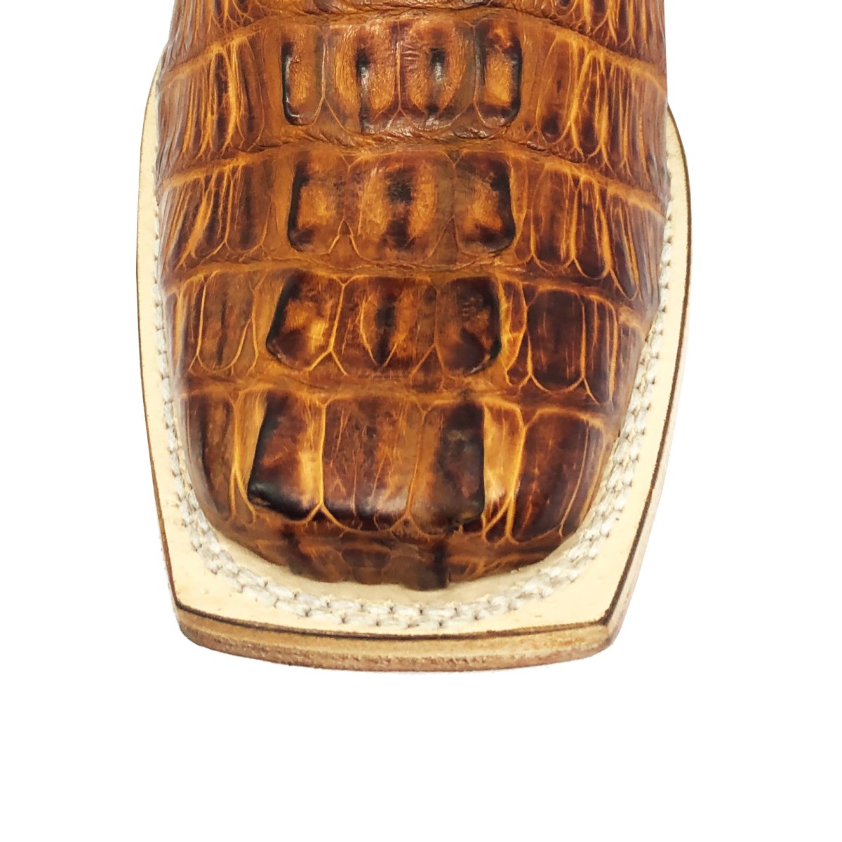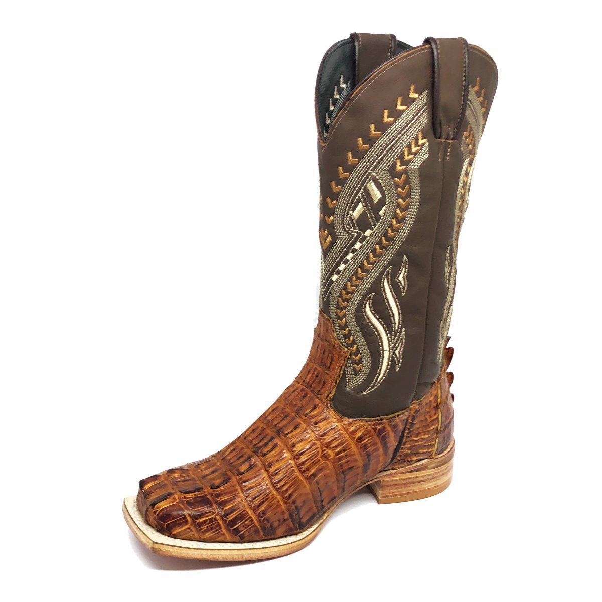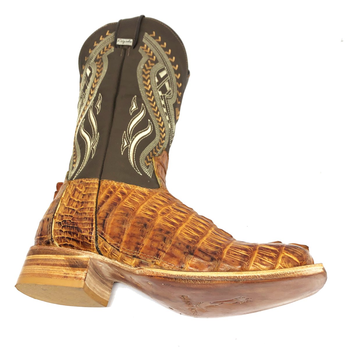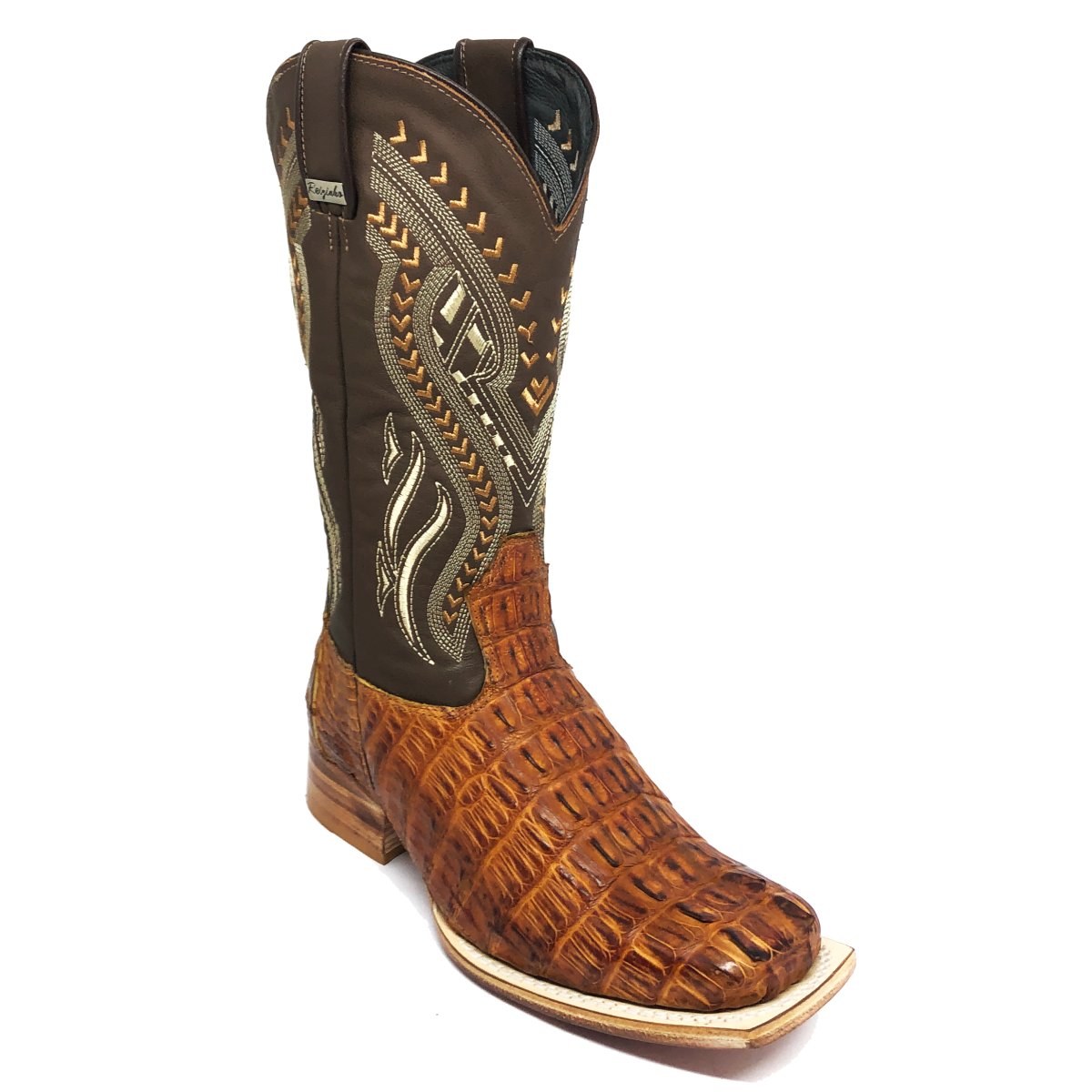 Bota Texana de Couro Legítimo de Jacaré Havana Escuro Rabo - Cano Alto, Bico Quadrado- Solado de Couro Artesanal | Reizinho Botas