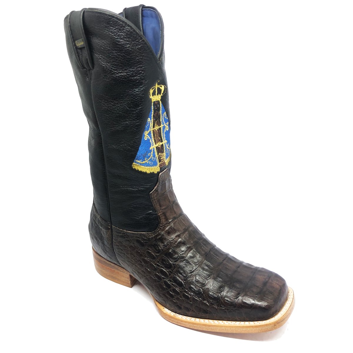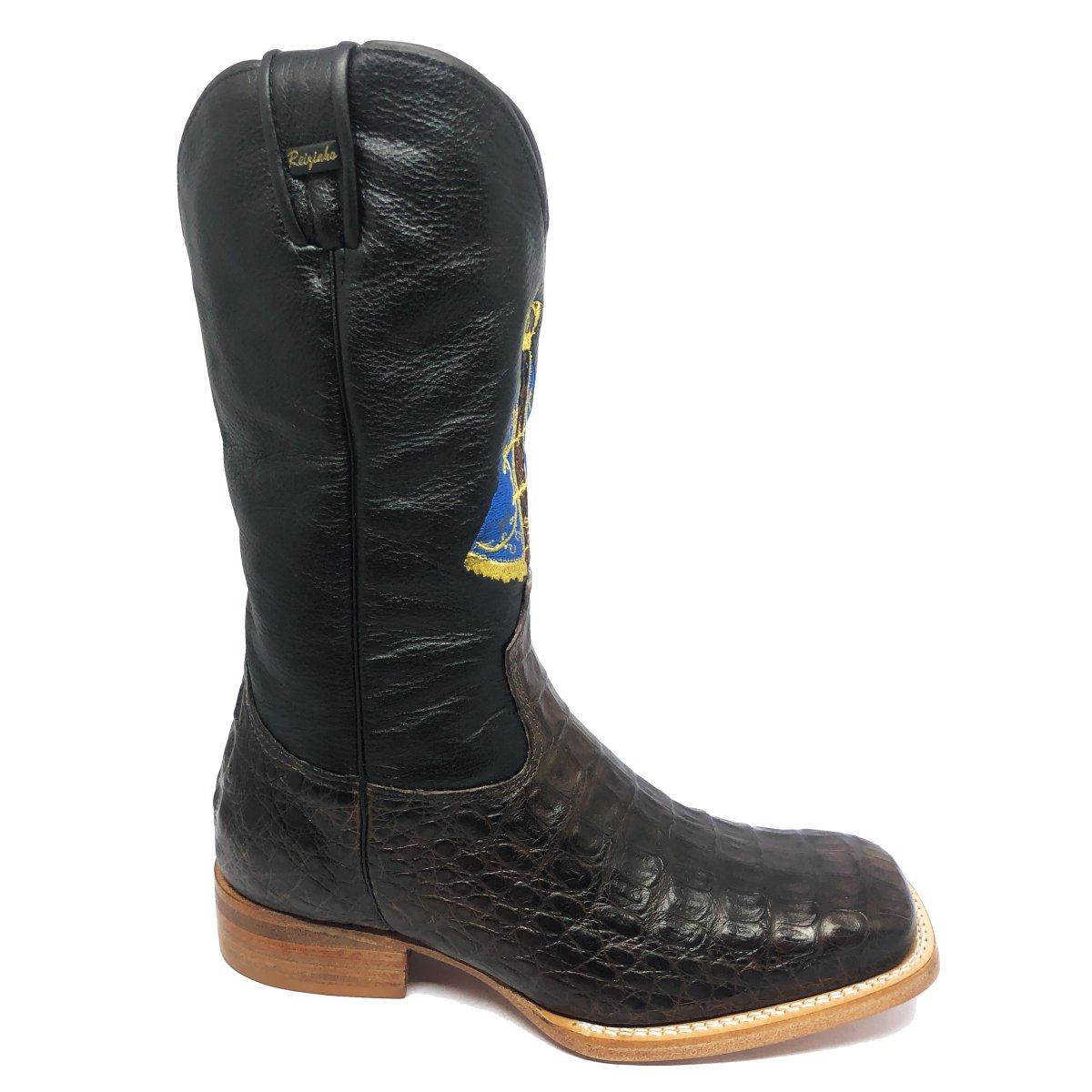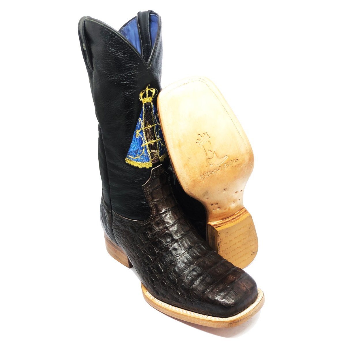 Bota Texana Reizinho de Couro Legítimo de Jacaré Marrom - Cano Alto, Bico Quadrado - Solado de Couro Artesanal