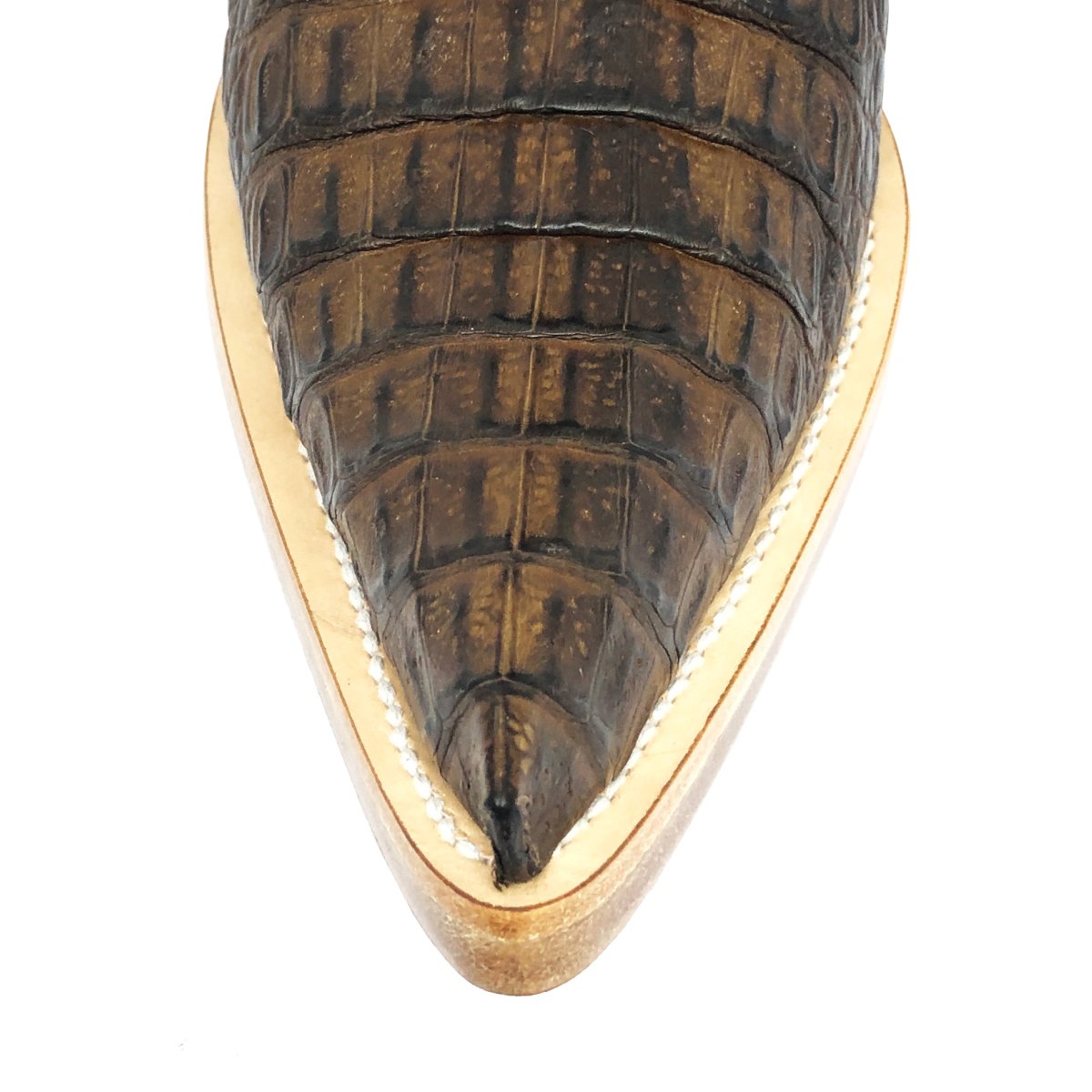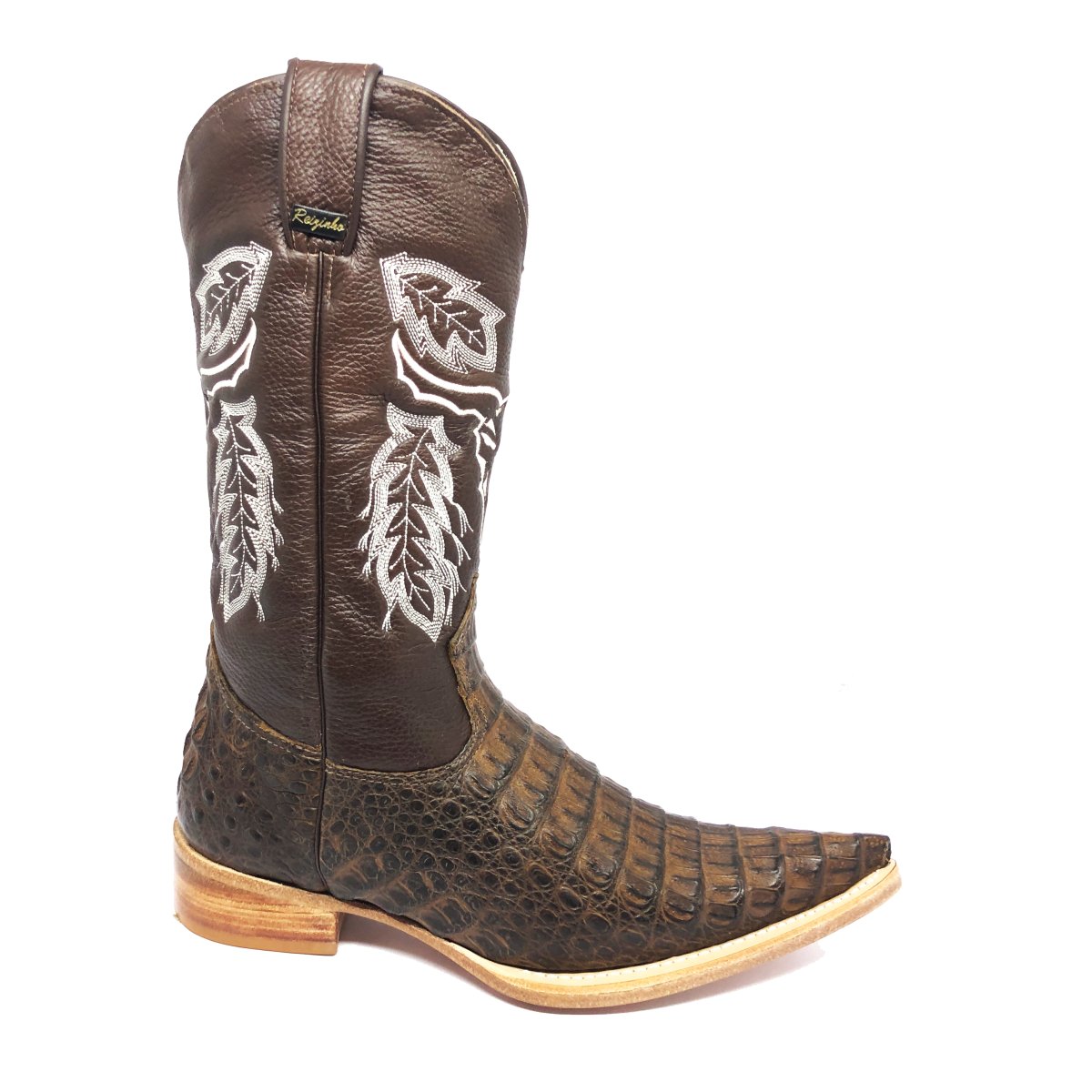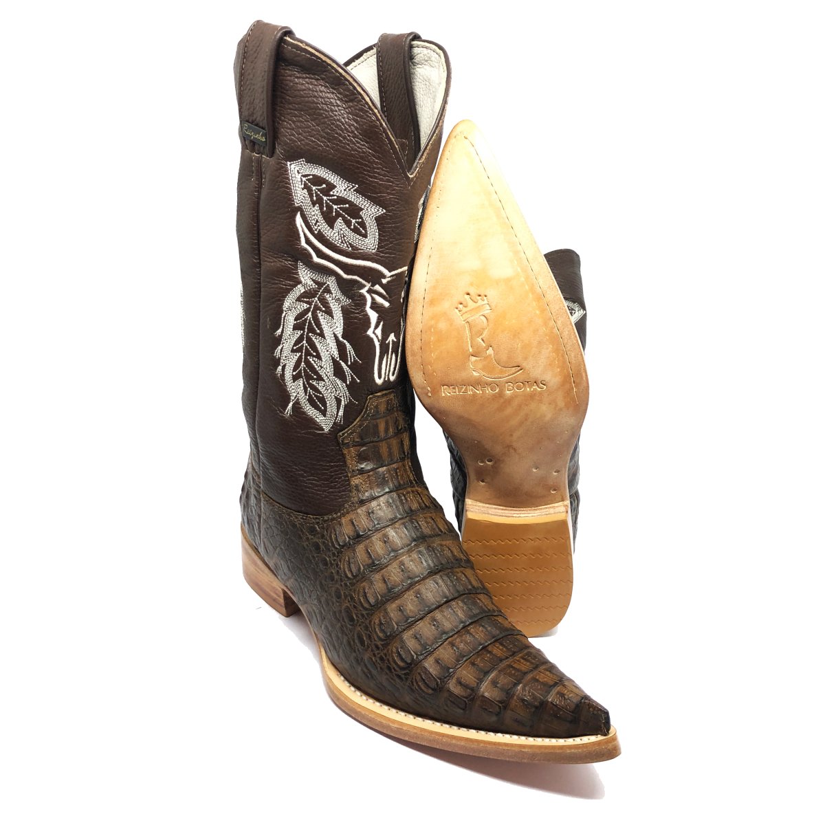Bota Texana Reizinho de Couro Legítimo de Jacaré Marrrom - Cano Alto, Bico Fino - Solado de Couro Artesanal