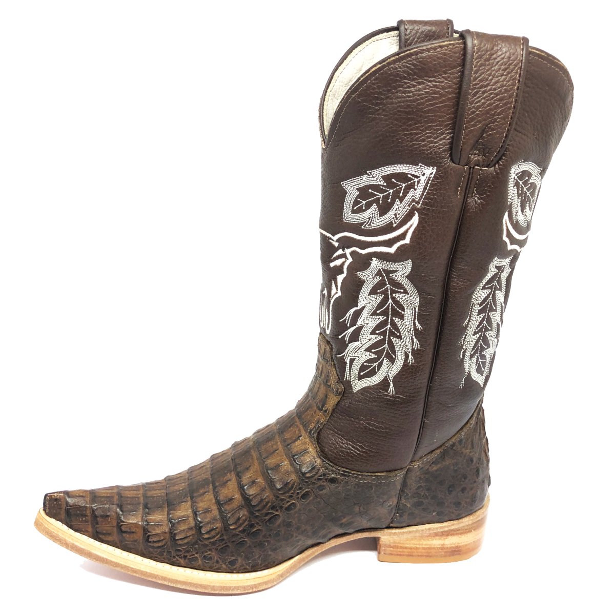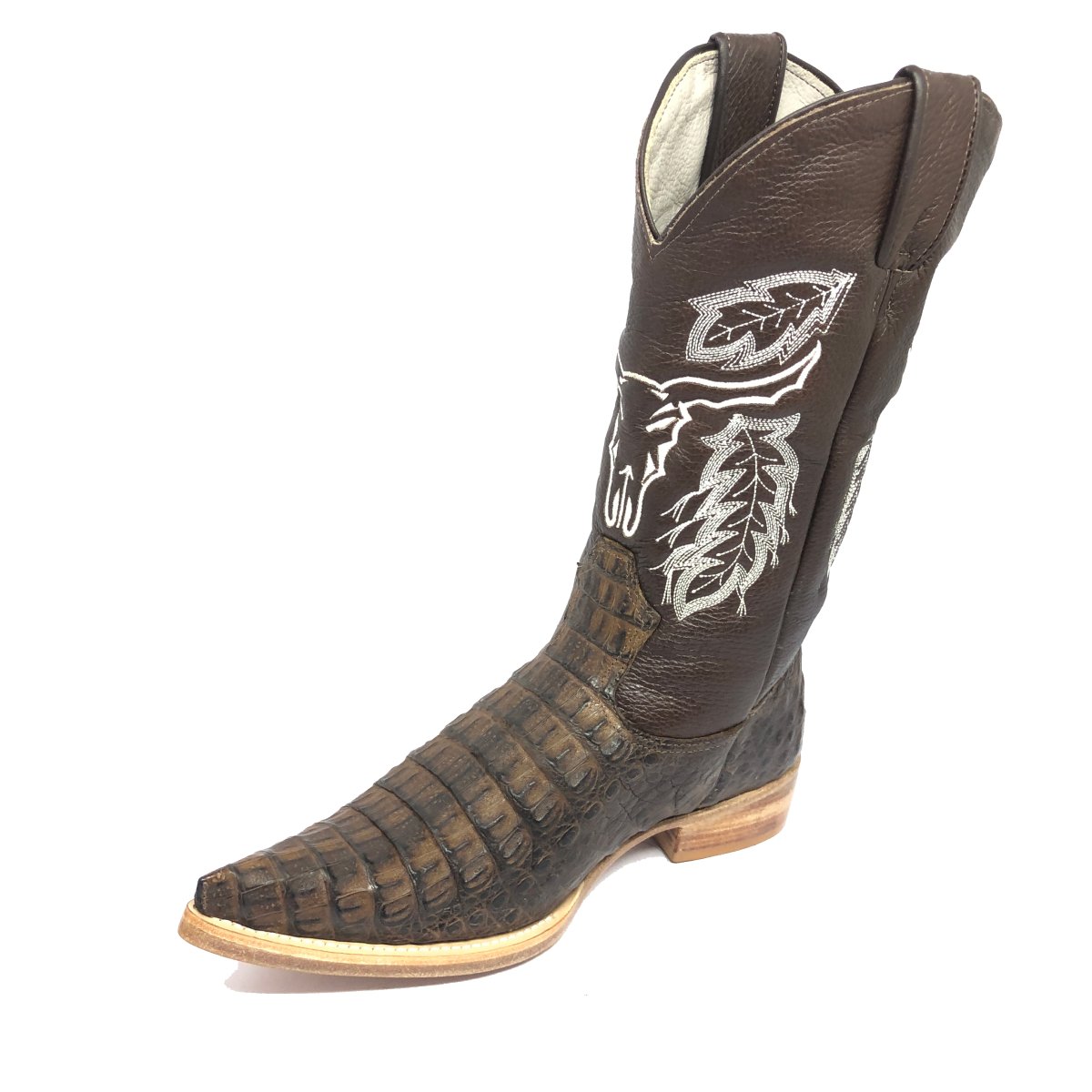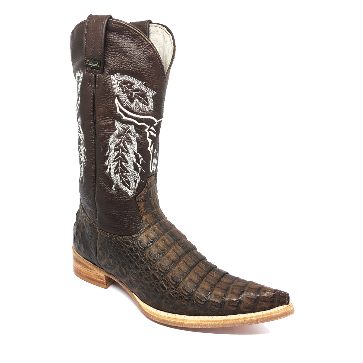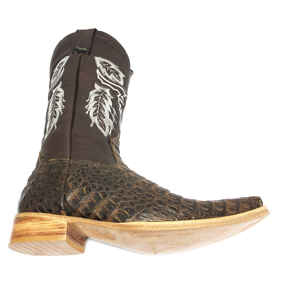 Bota Texana Reizinho de Couro Legítimo de Jacaré Marrrom - Cano Alto, Bico Fino - Solado de Couro Artesanal