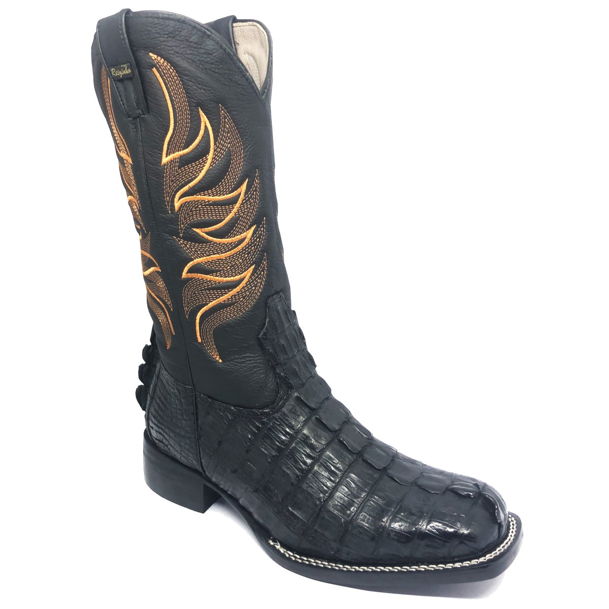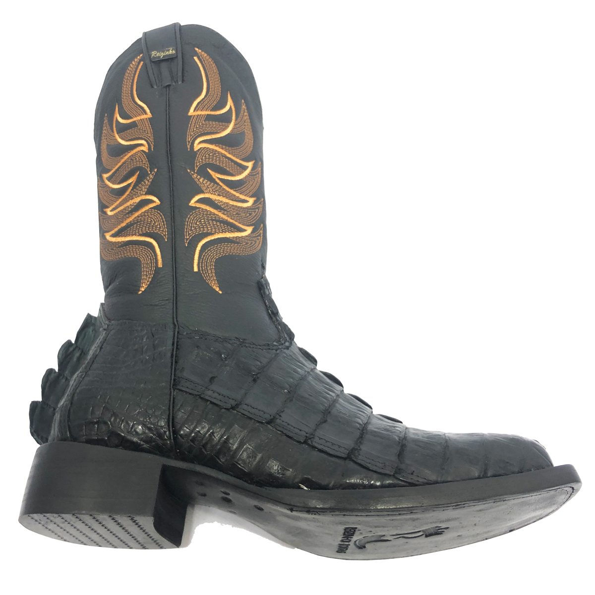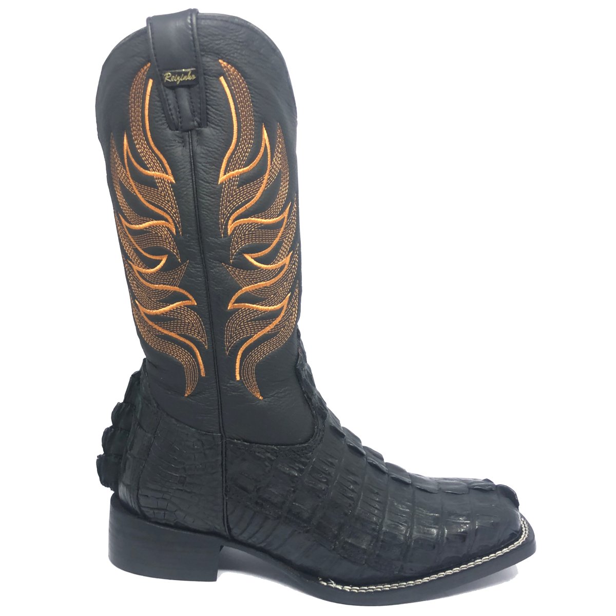 Bota Texana Reizinho de Couro Legítimo de Jacaré Preto Rabo - Cano Alto, Bico Quadrado - Solado de Couro Artesanal