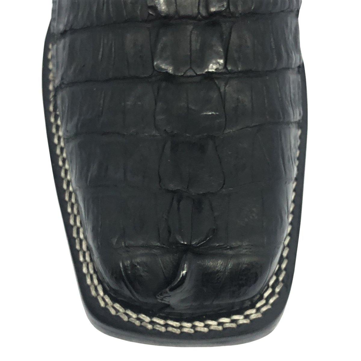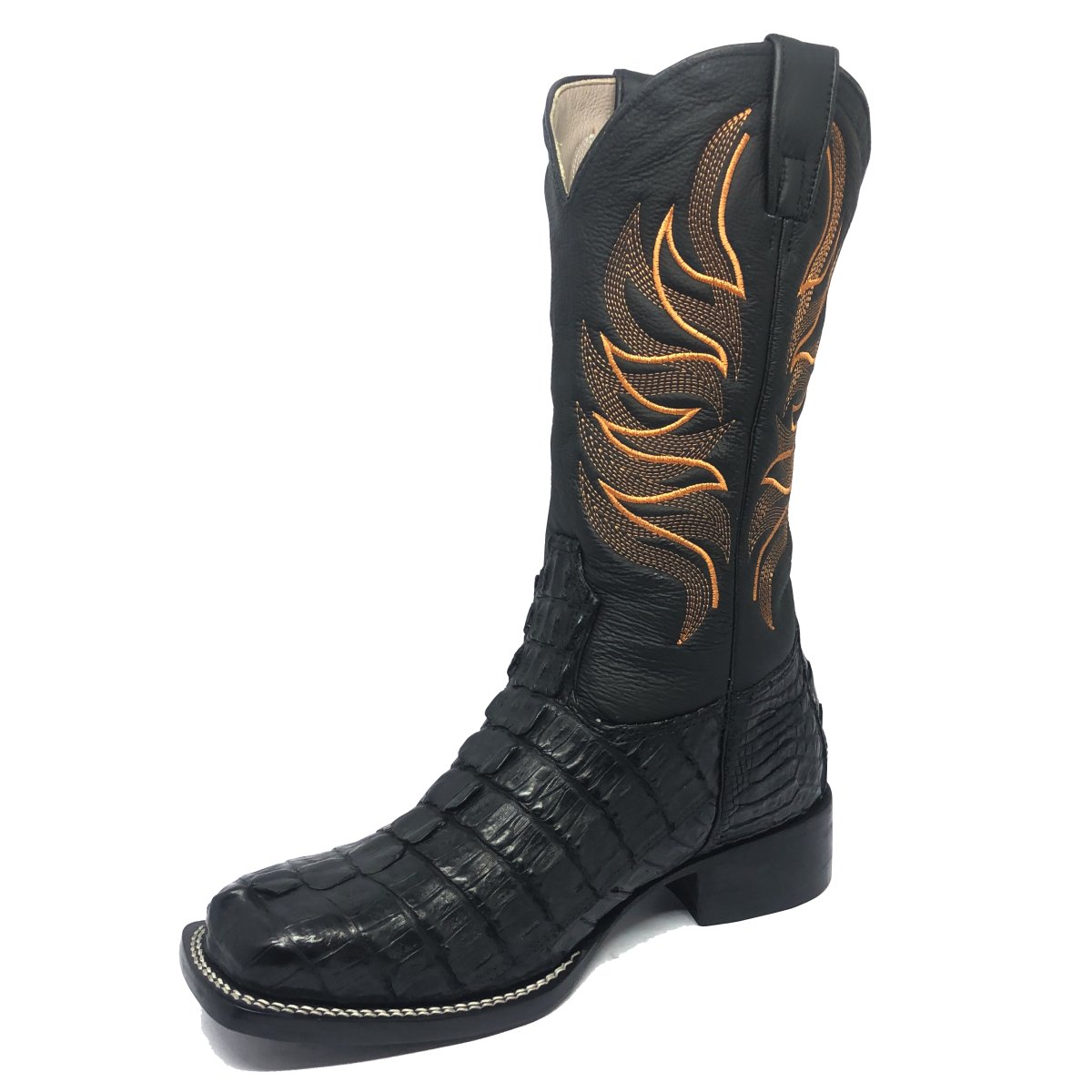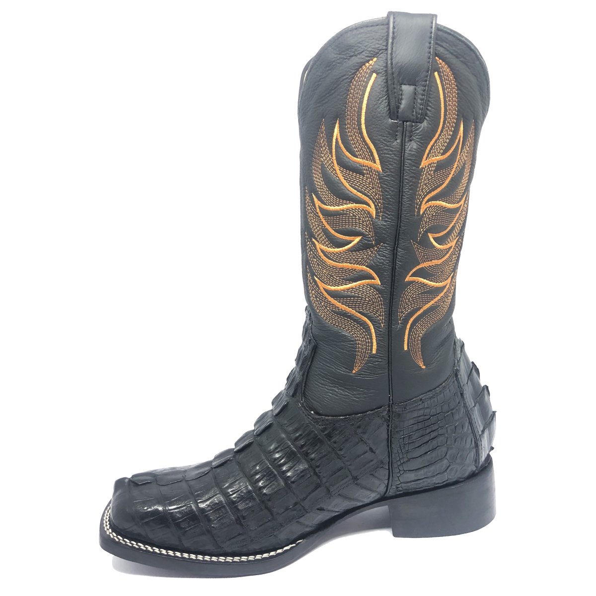 Bota Texana Reizinho de Couro Legítimo de Jacaré Preto Rabo - Cano Alto, Bico Quadrado - Solado de Couro Artesanal