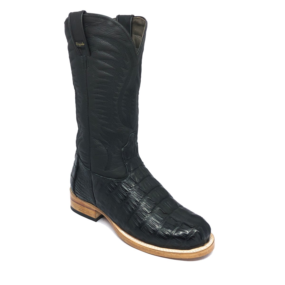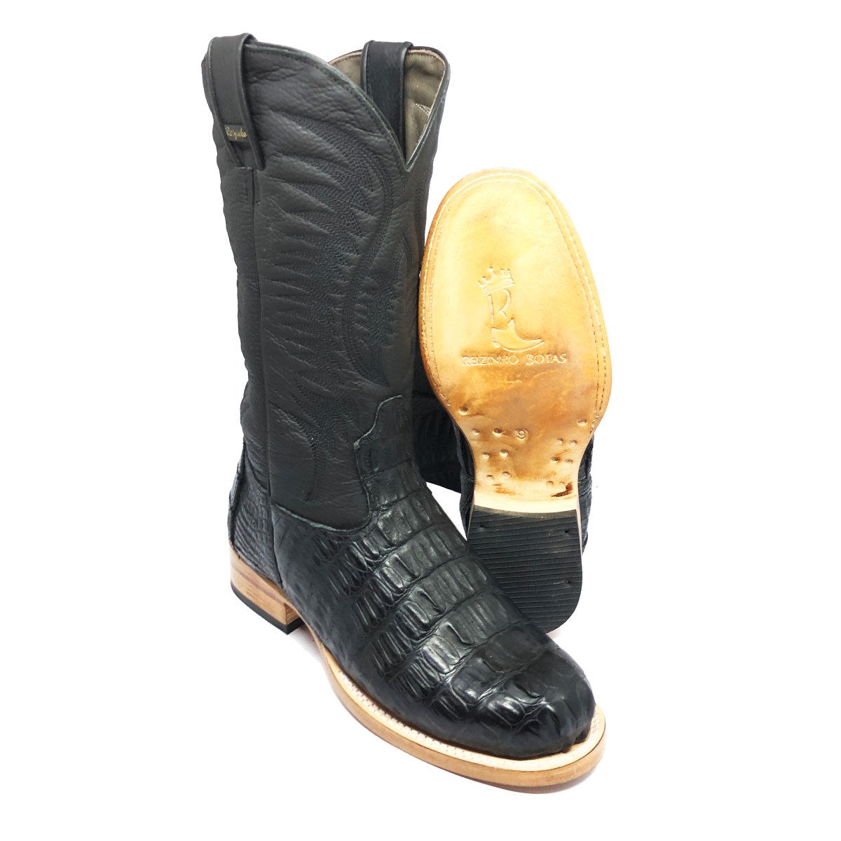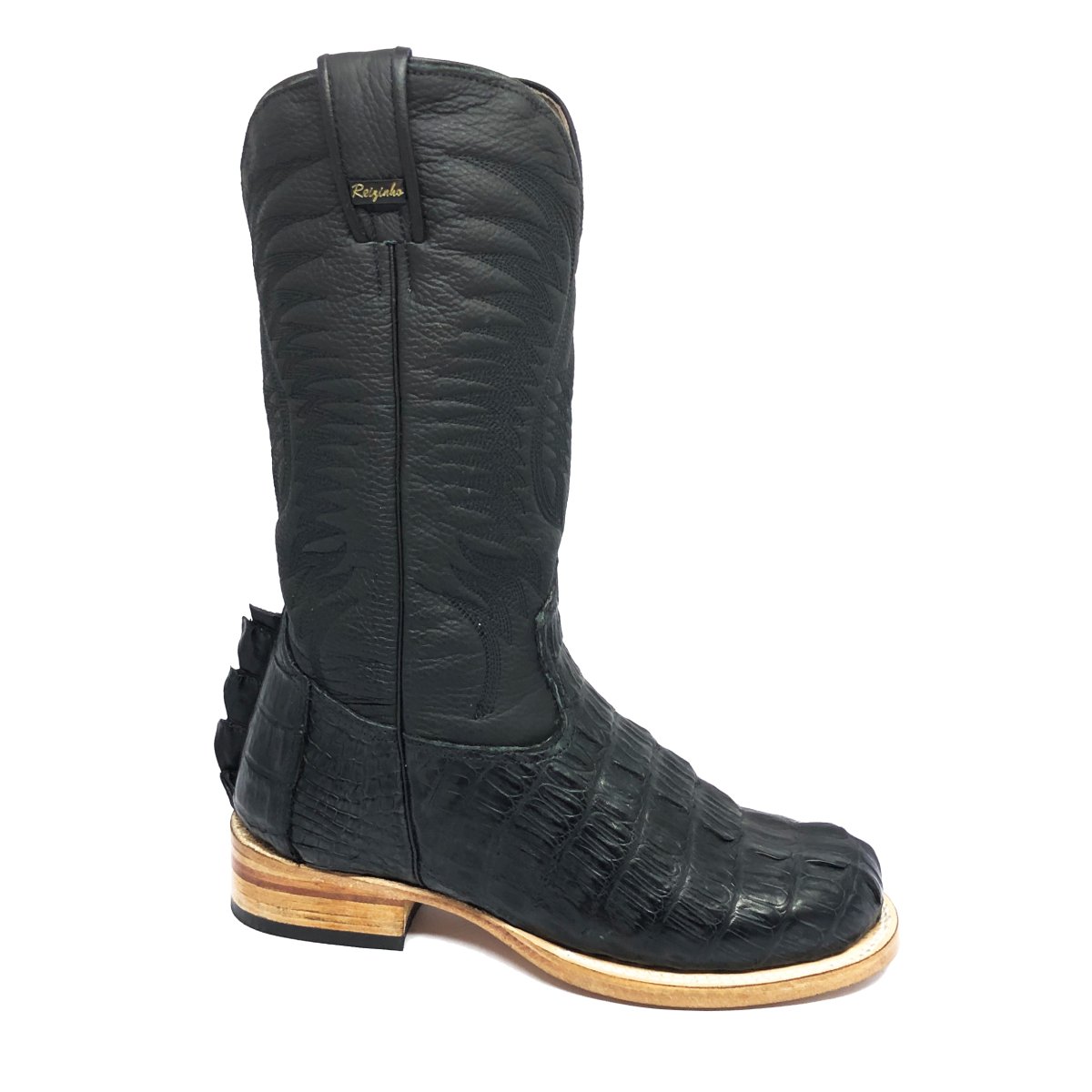 Bota Texana Reizinho de Couro Legítimo de Jacaré Preto Rabo - Cano Alto, Bico Redondo - Solado de Couro Artesanal