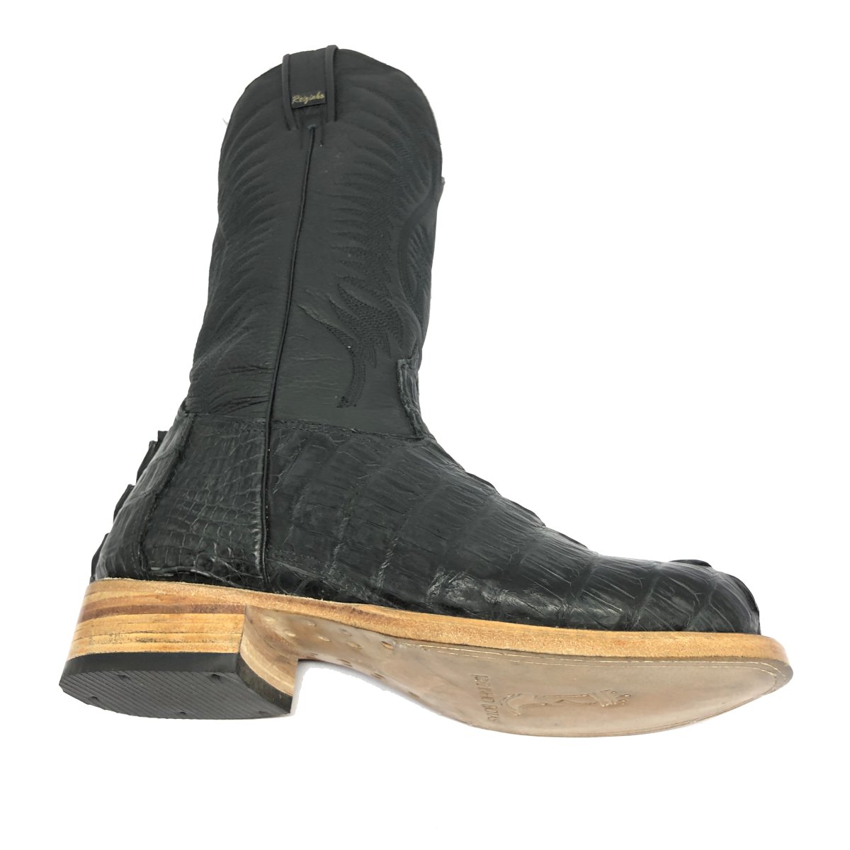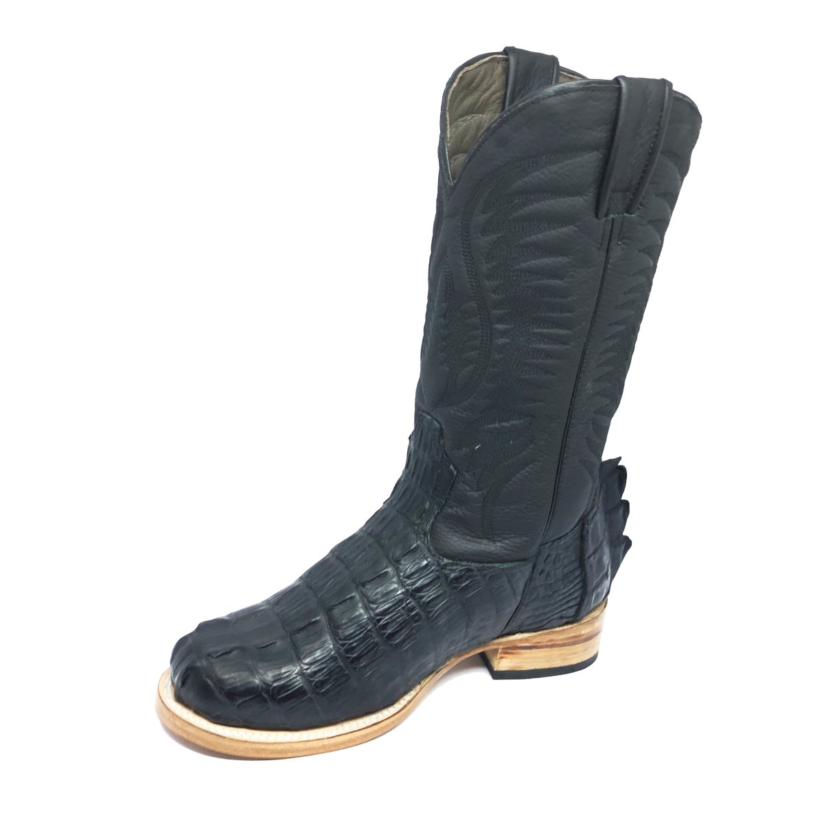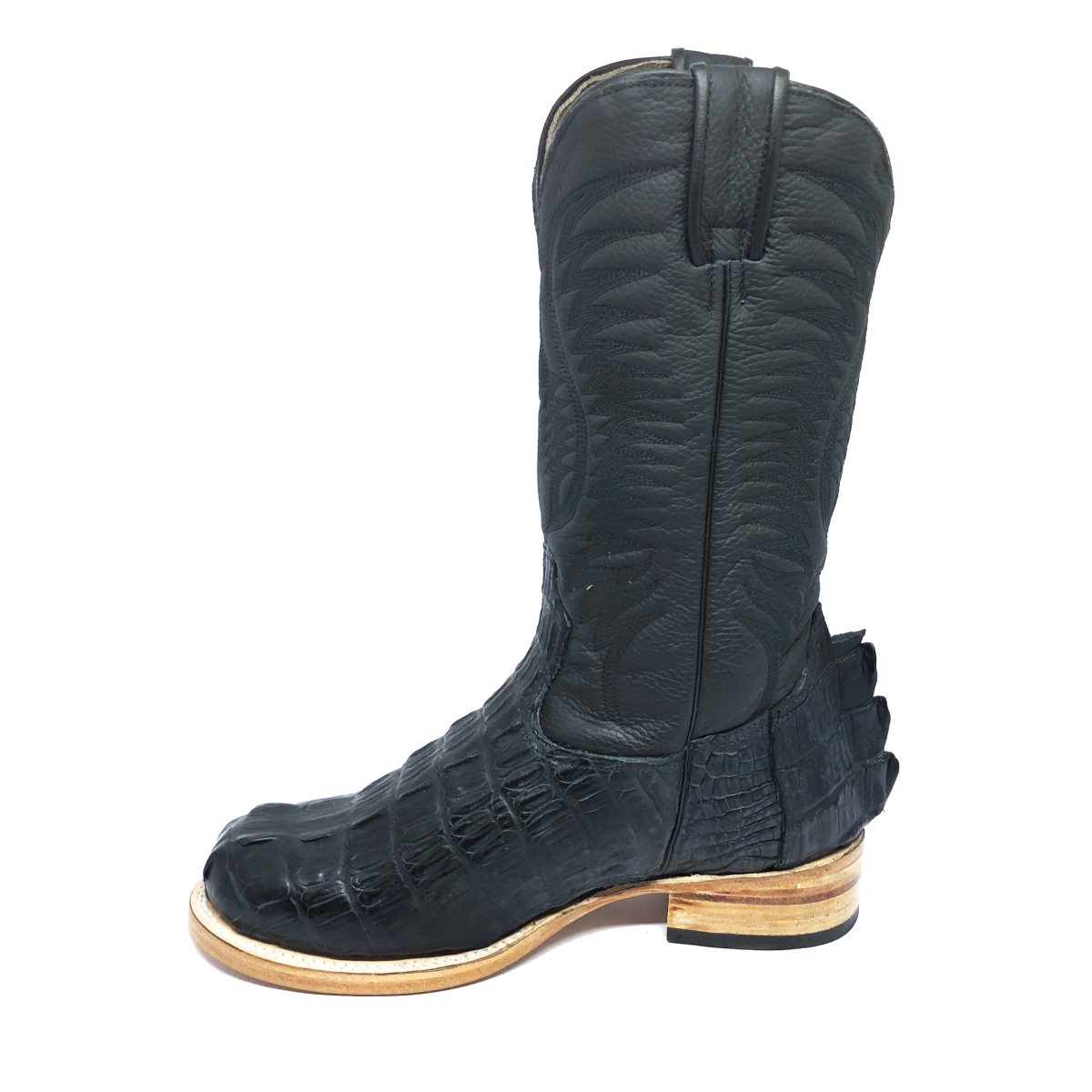 Bota Texana Reizinho de Couro Legítimo de Jacaré Preto Rabo - Cano Alto, Bico Redondo - Solado de Couro Artesanal