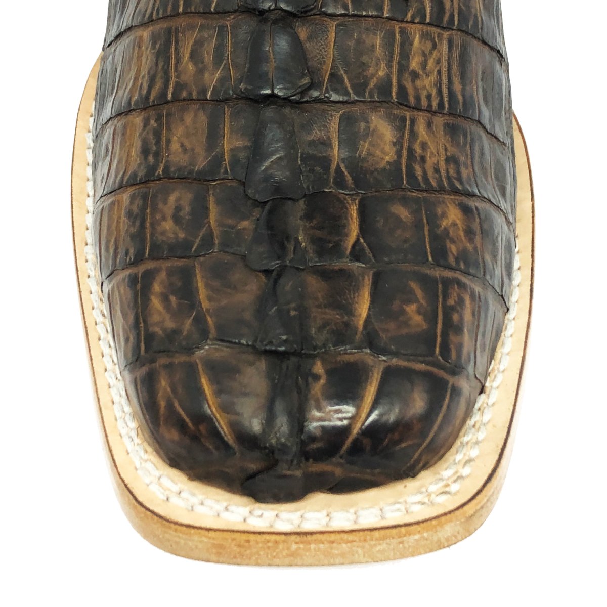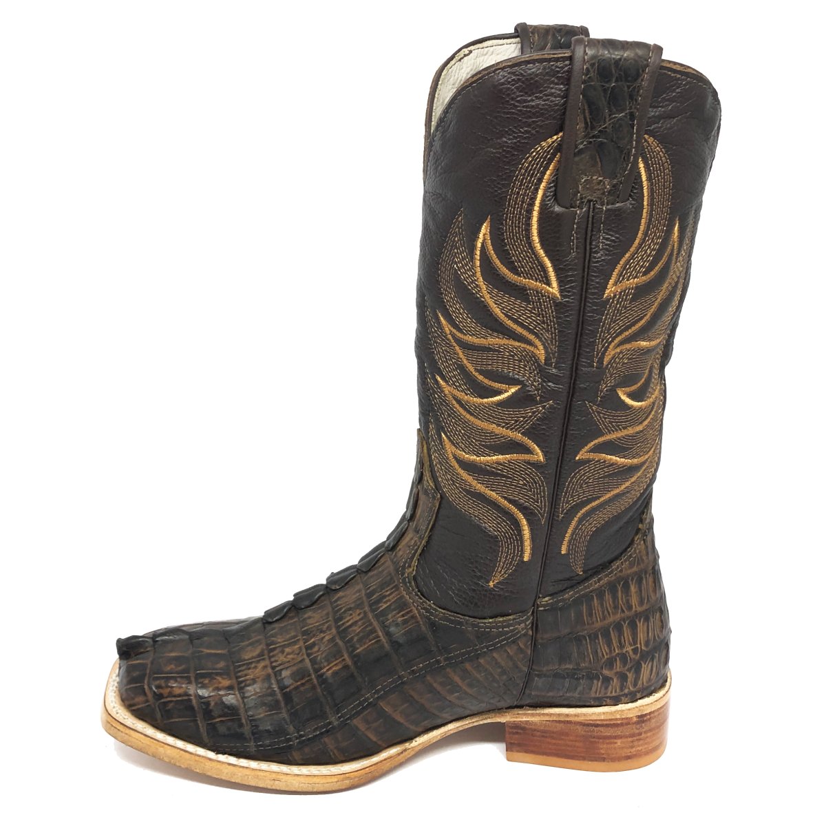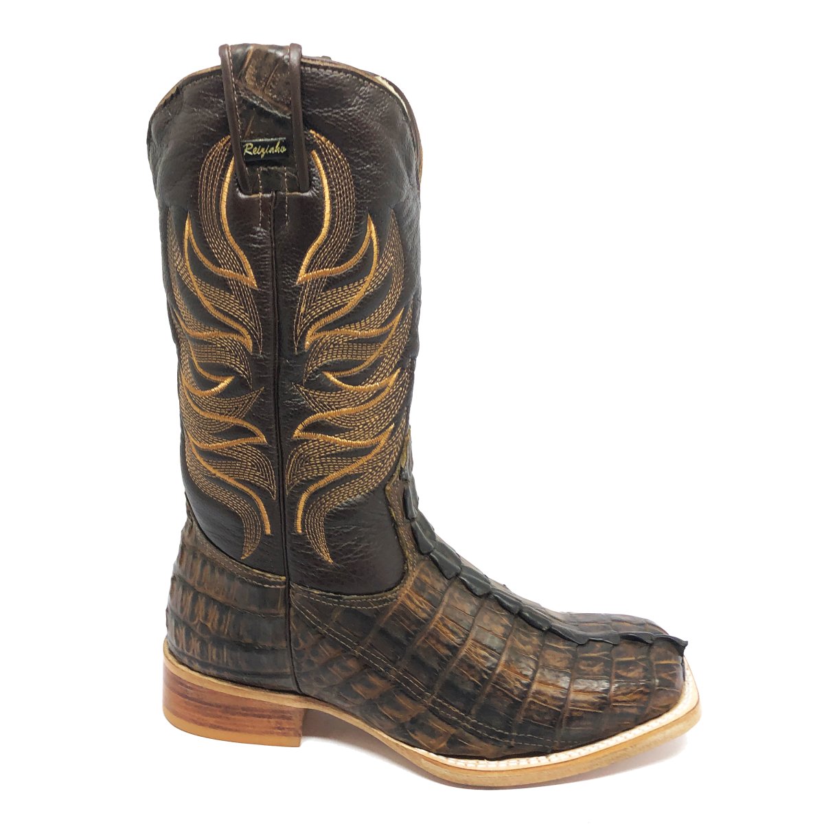 Bota Texana Reizinho de Couro Legítimo de Jacaré Tabaco Rabo - Cano Alto, Bico Quadrado - Solado de Couro Artesanal