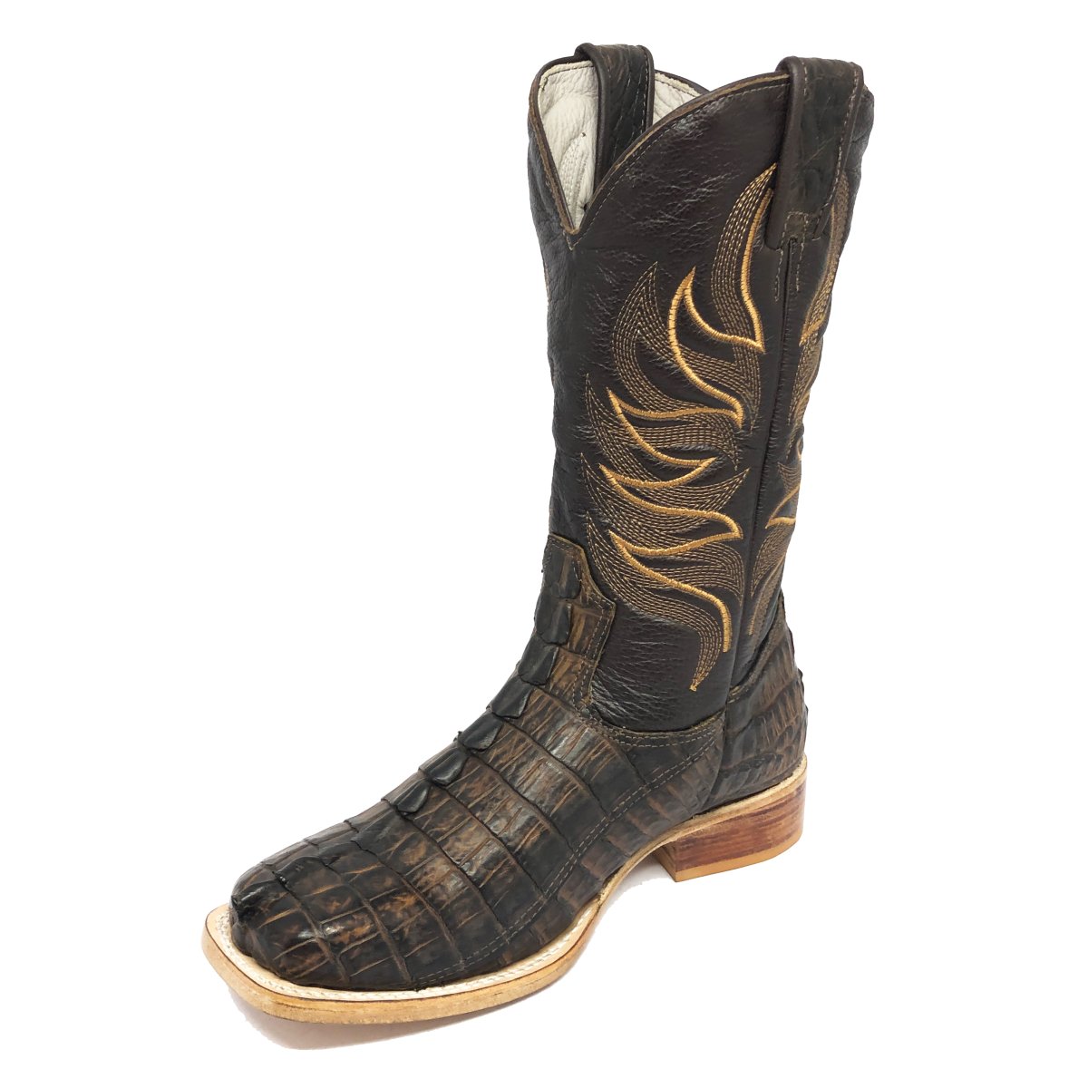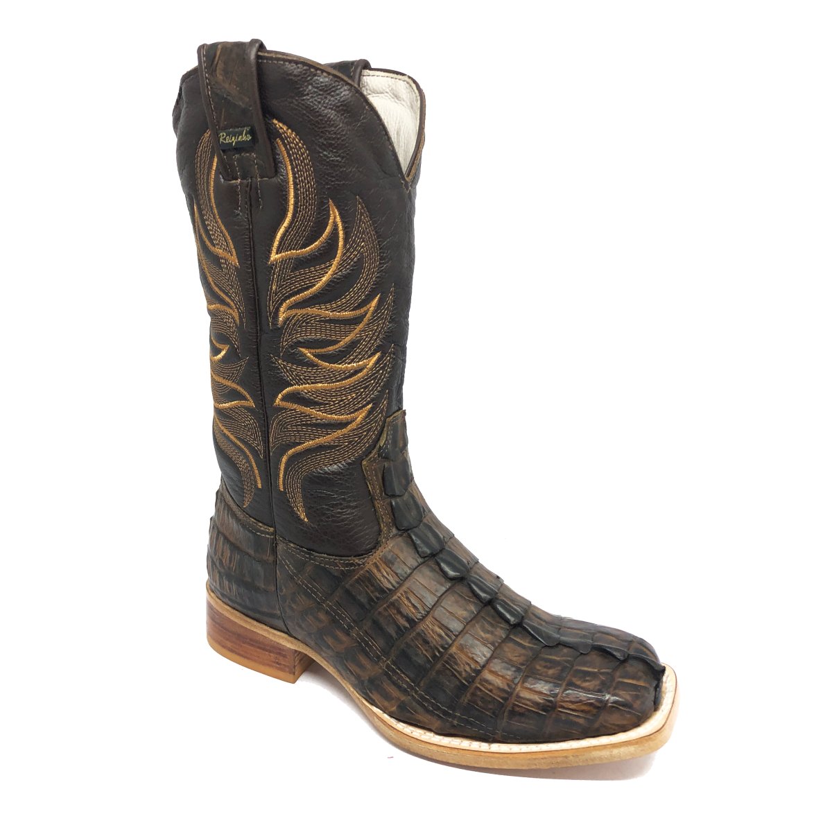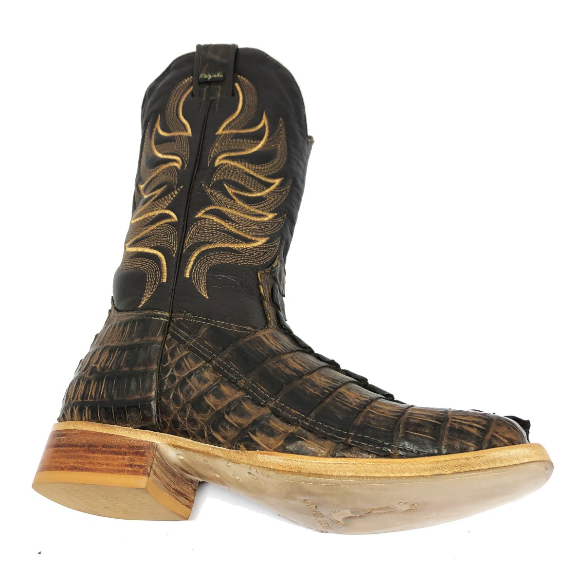 Bota Texana Reizinho de Couro Legítimo de Jacaré Tabaco Rabo - Cano Alto, Bico Quadrado - Solado de Couro Artesanal