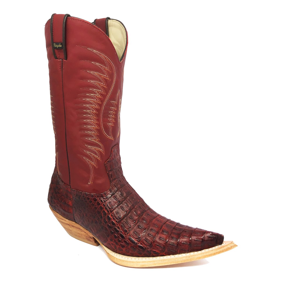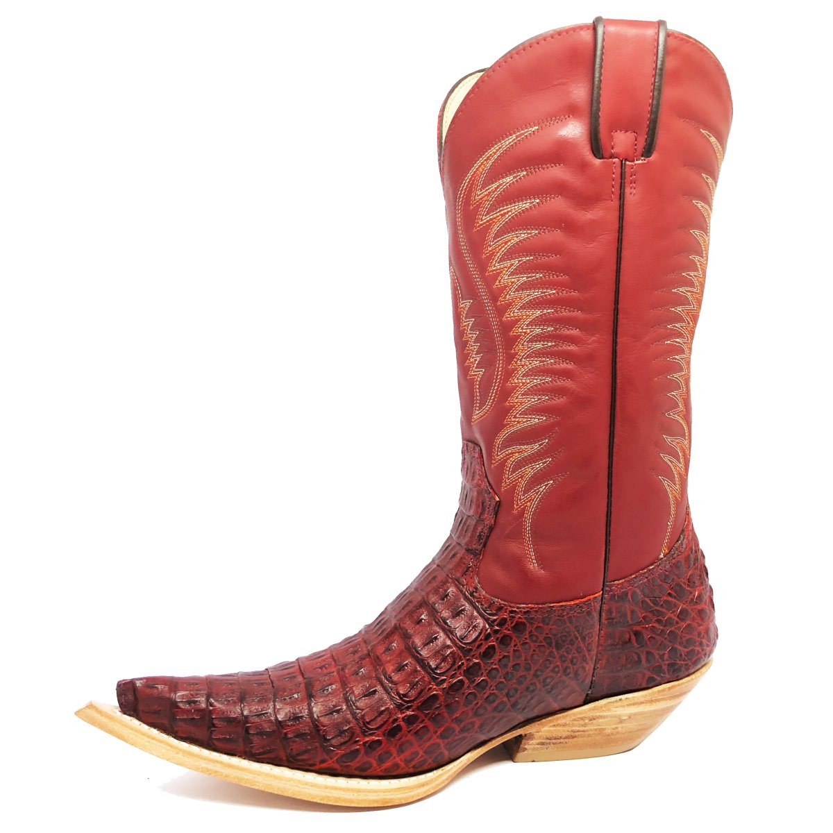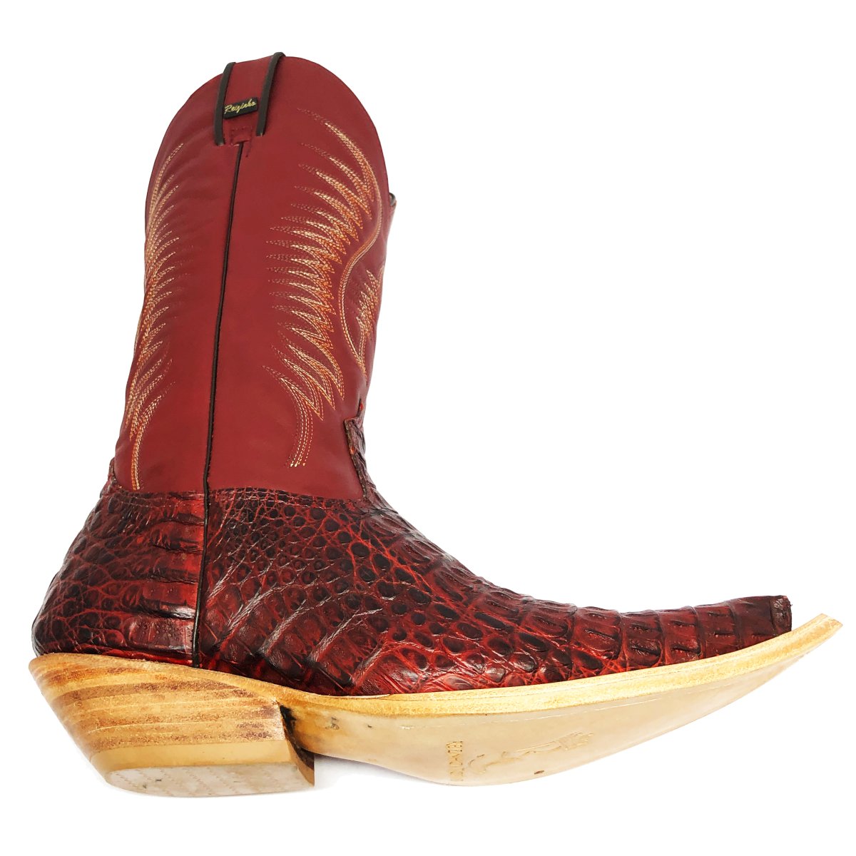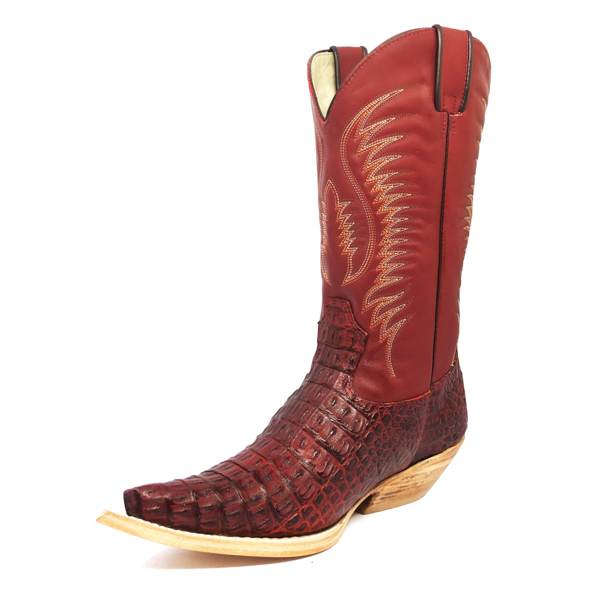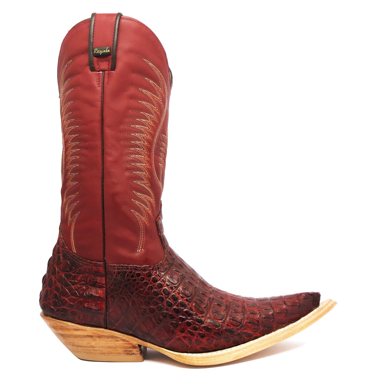 Bota Texana Reizinho de Couro Legítimo de Jacaré Vinho - Cano Alto, Bico Fino - Solado de Couro Artesanal