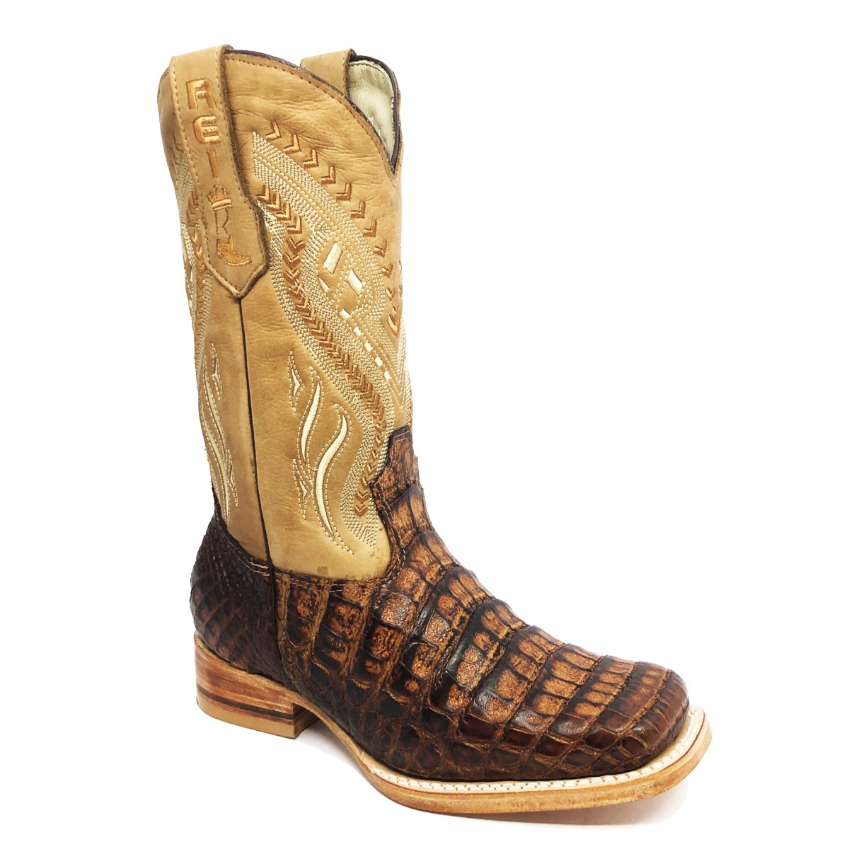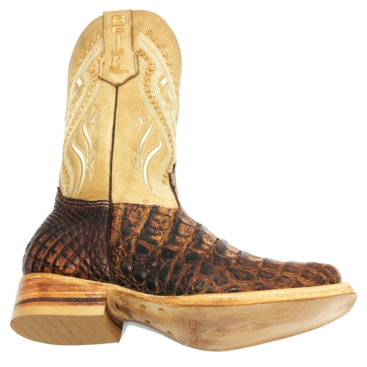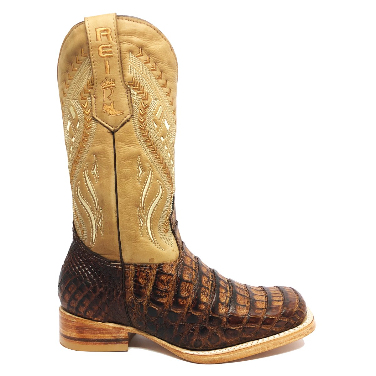 Bota Texana Reizinho Premium de Couro de Jacaré Havana Escuro LIMITED EDITION - Cano Alto, Bico Quadrado - Solado de Couro Artesanal
