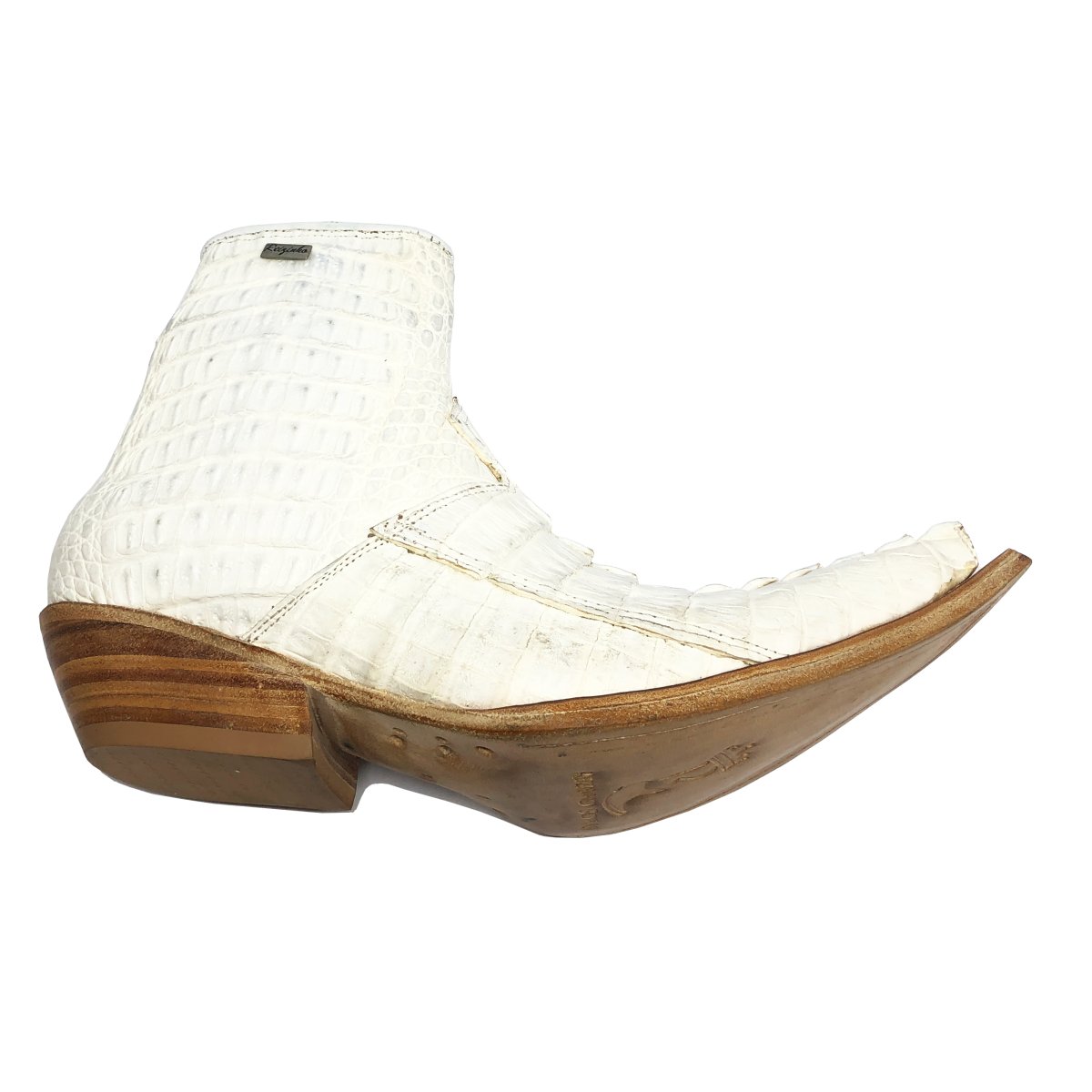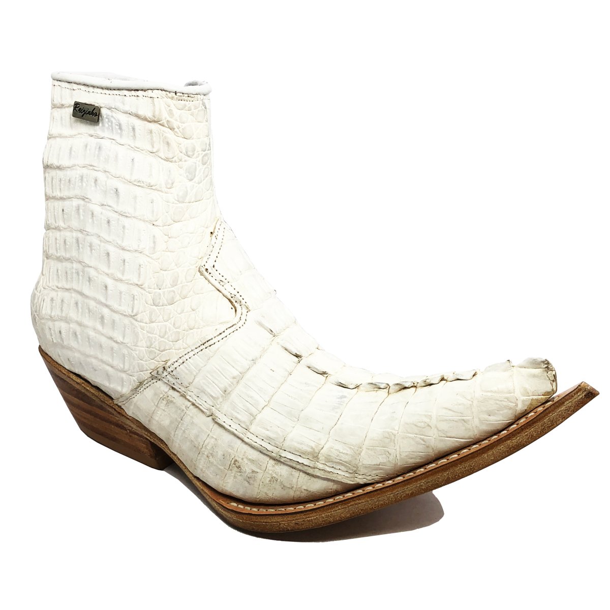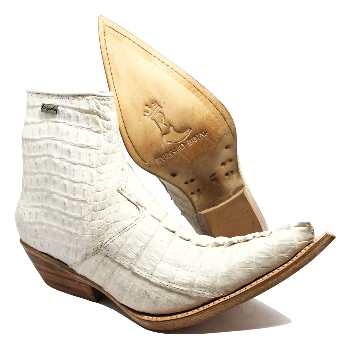 Bota Texana Reizinho Premium de Couro Legítimo de Jacaré Branco Rabo LIMITED EDITION - Cano Curto, Bico Fino Inclinado - Solado de Couro Artesanal