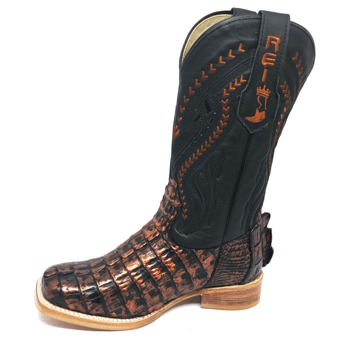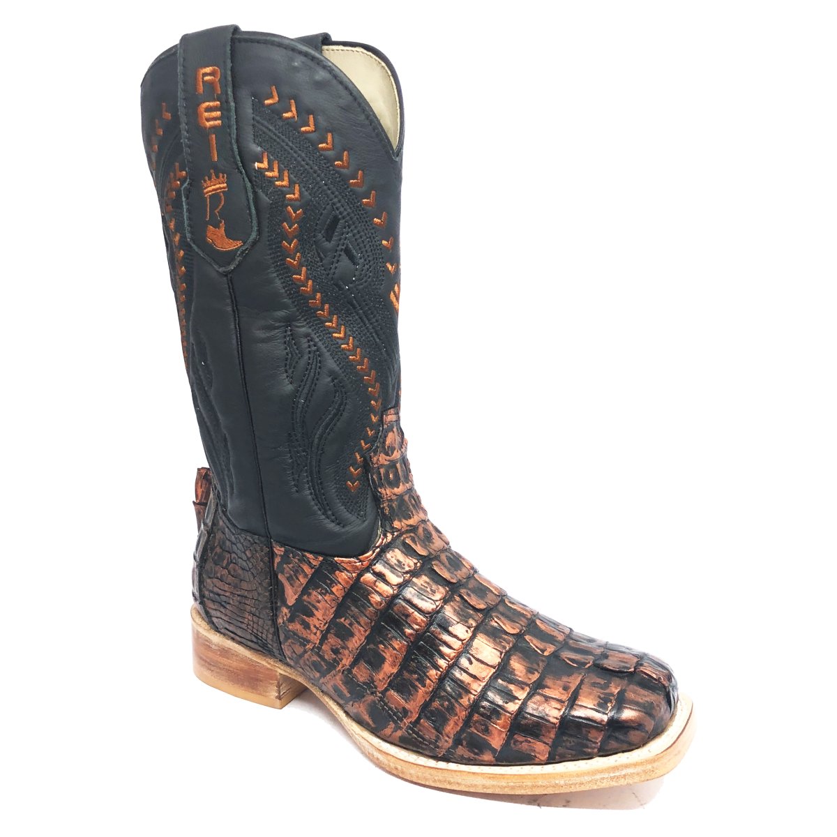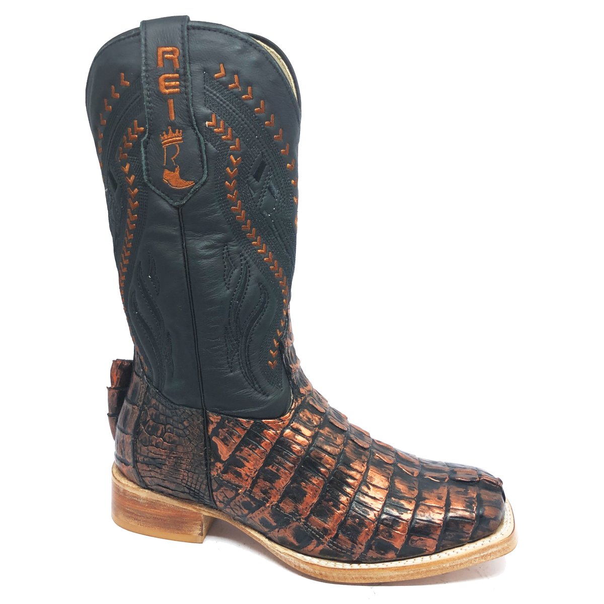 Bota Texana Reizinho Premium de Couro Legítimo de Jacaré Bronze Rabo LIMITED EDITION - Cano Alto, Bico Quadrado - Solado de Couro Artesanal