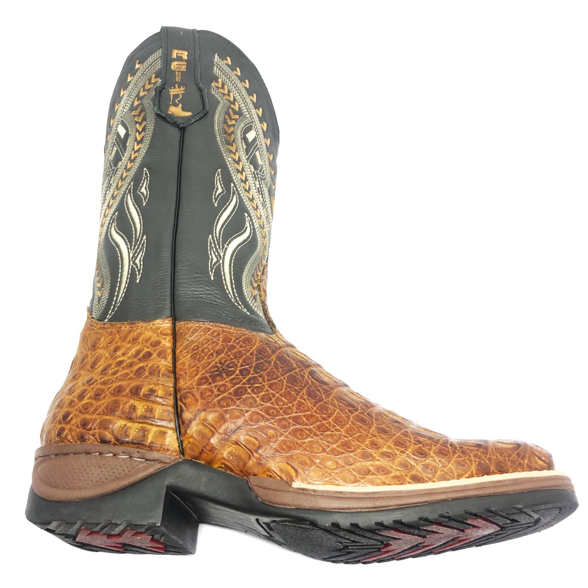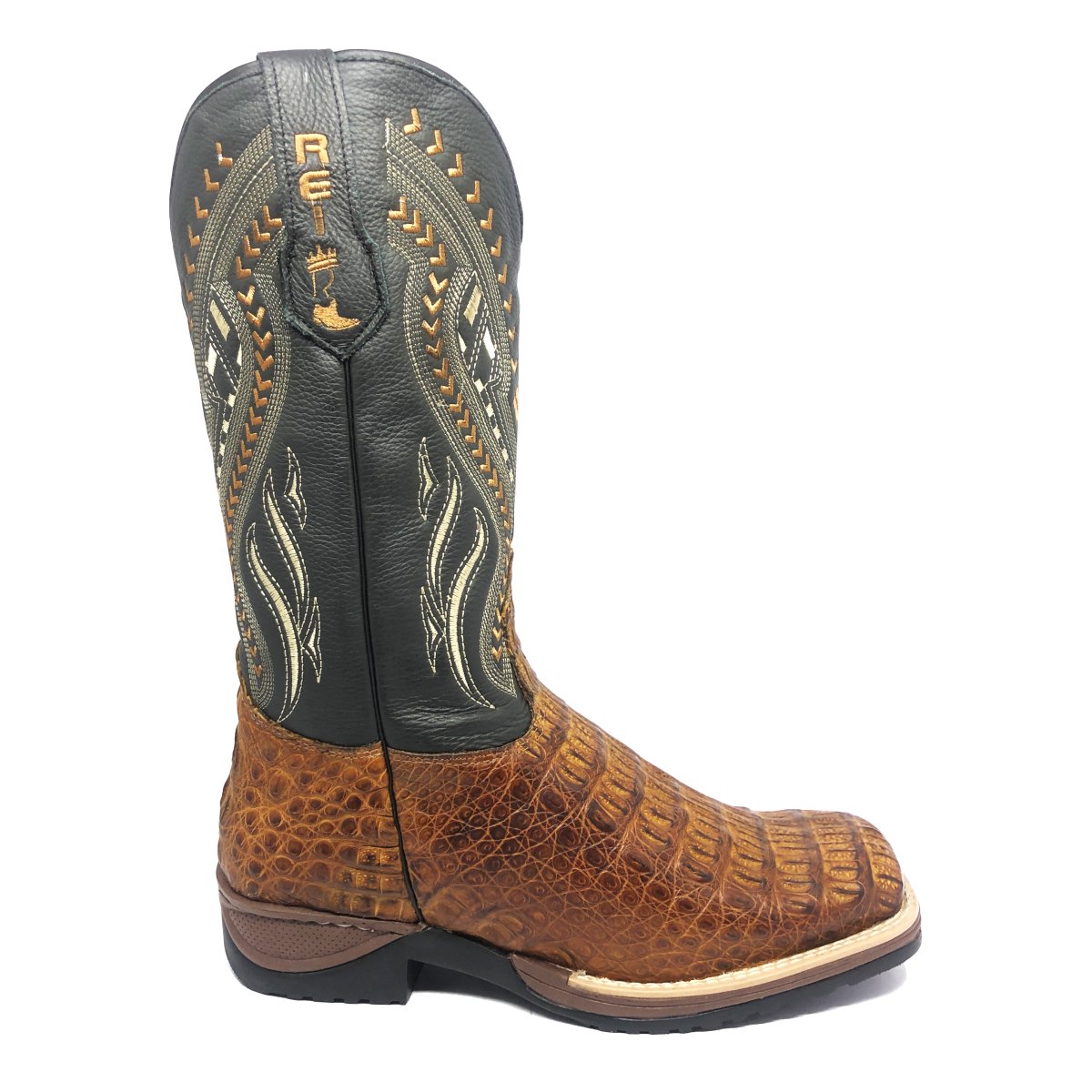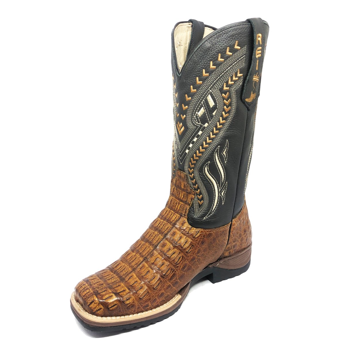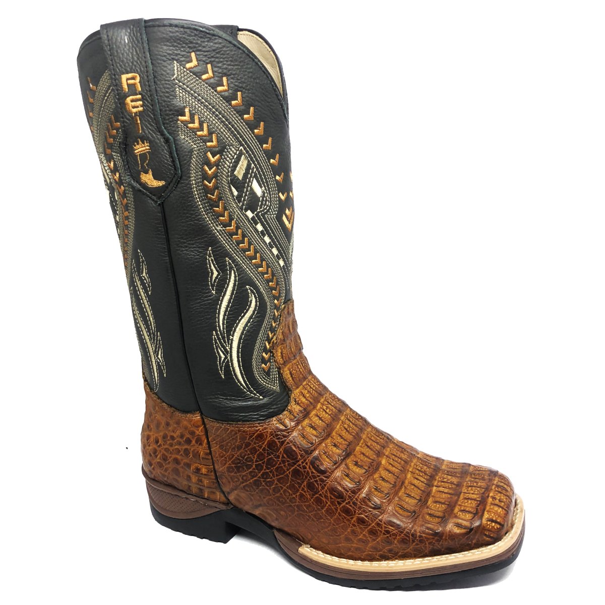 Bota Texana Reizinho Premium de Couro Legítimo de Jacaré Havana Escuro - Cano Alto, Bico Quadrado - Solado Jump