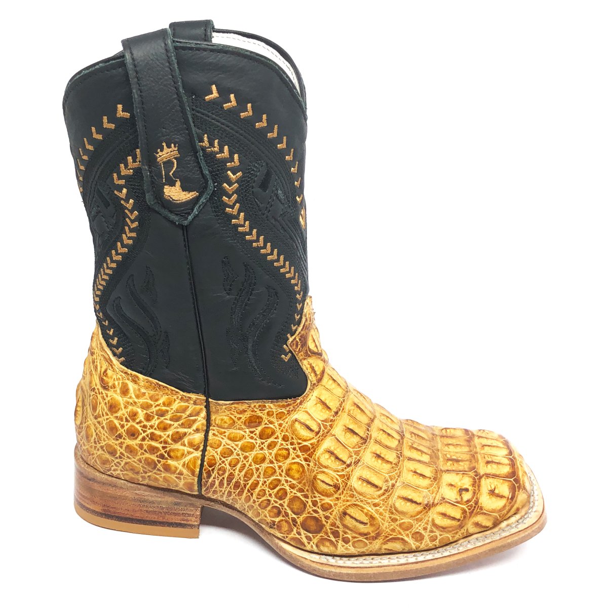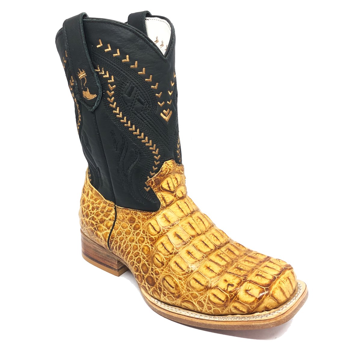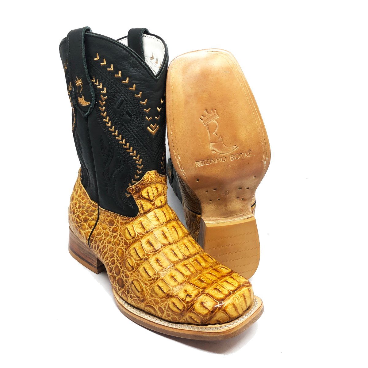 Bota Texana Reizinho Premium de Couro Legítimo de Jacaré Havana LIMITED EDITION - Cano Médio, Bico Quadrado - Solado de Couro Artesanal