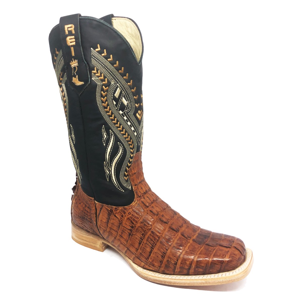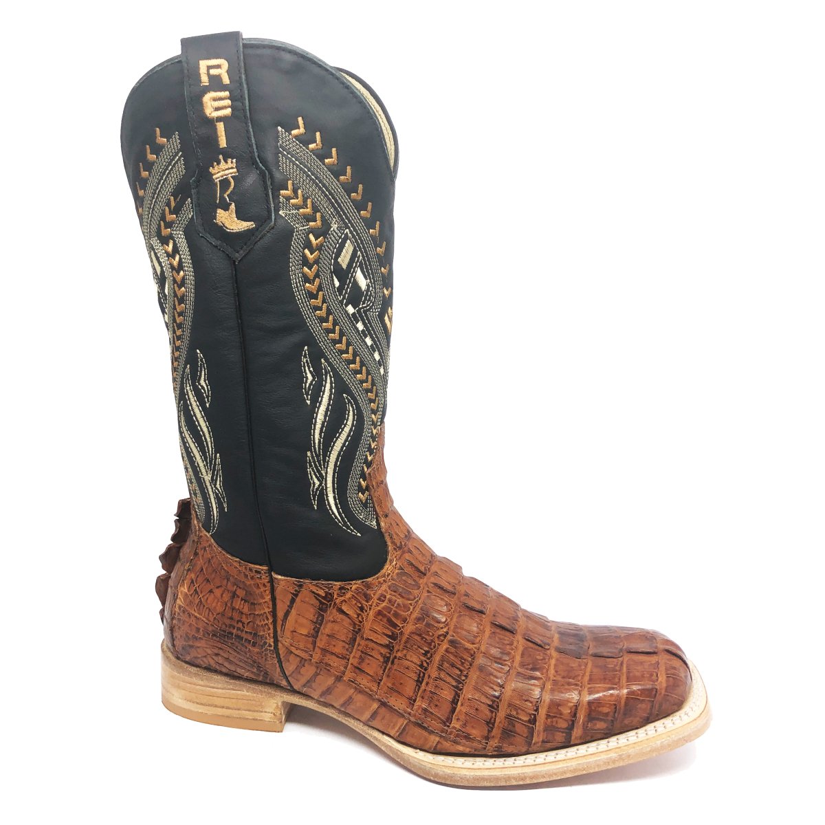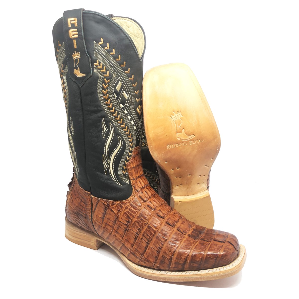 Bota Texana Reizinho Premium de Couro Legítimo de Jacaré Havana Rabo LIMITED EDITION - Cano Alto, Bico Quadrado - Solado de Couro Artesanal
