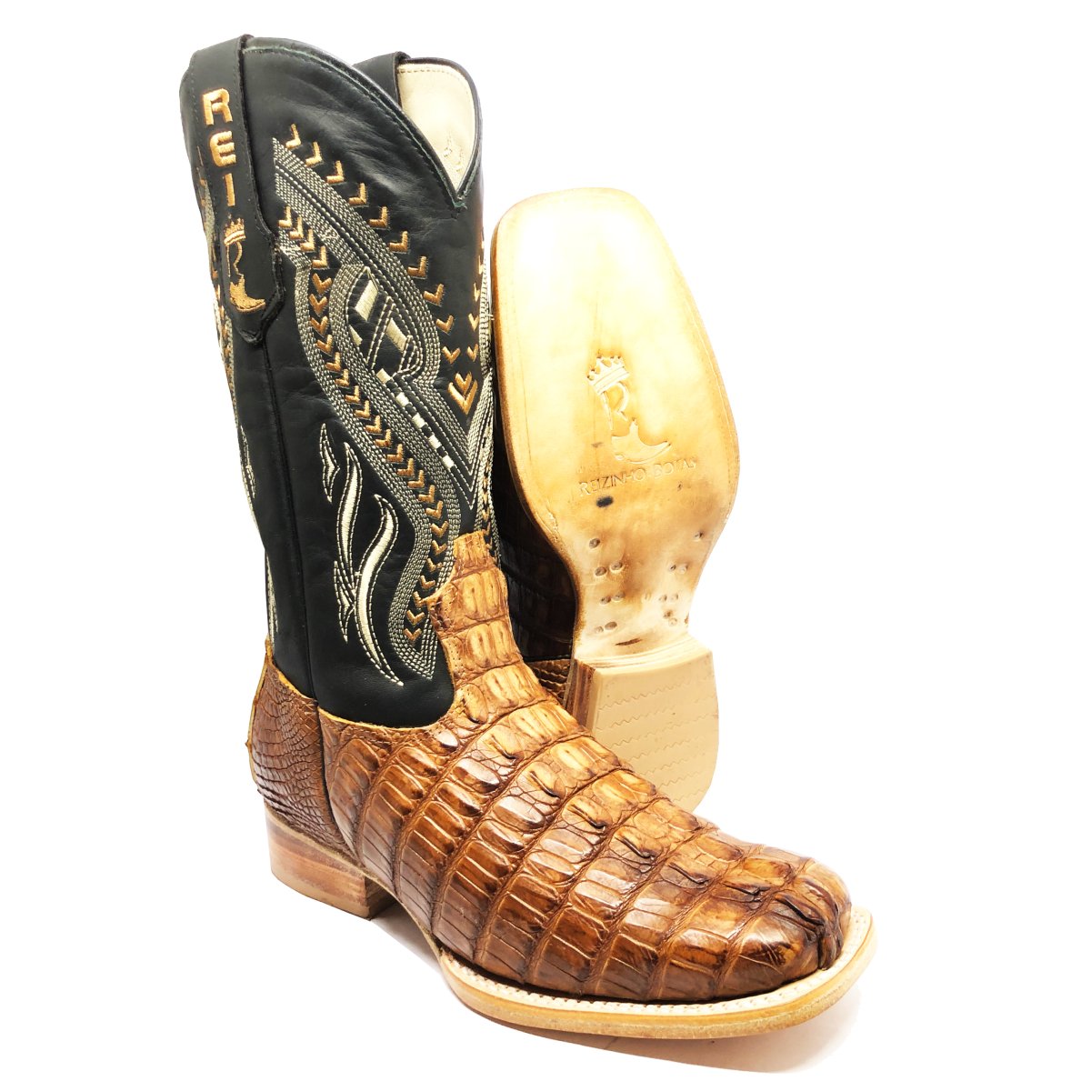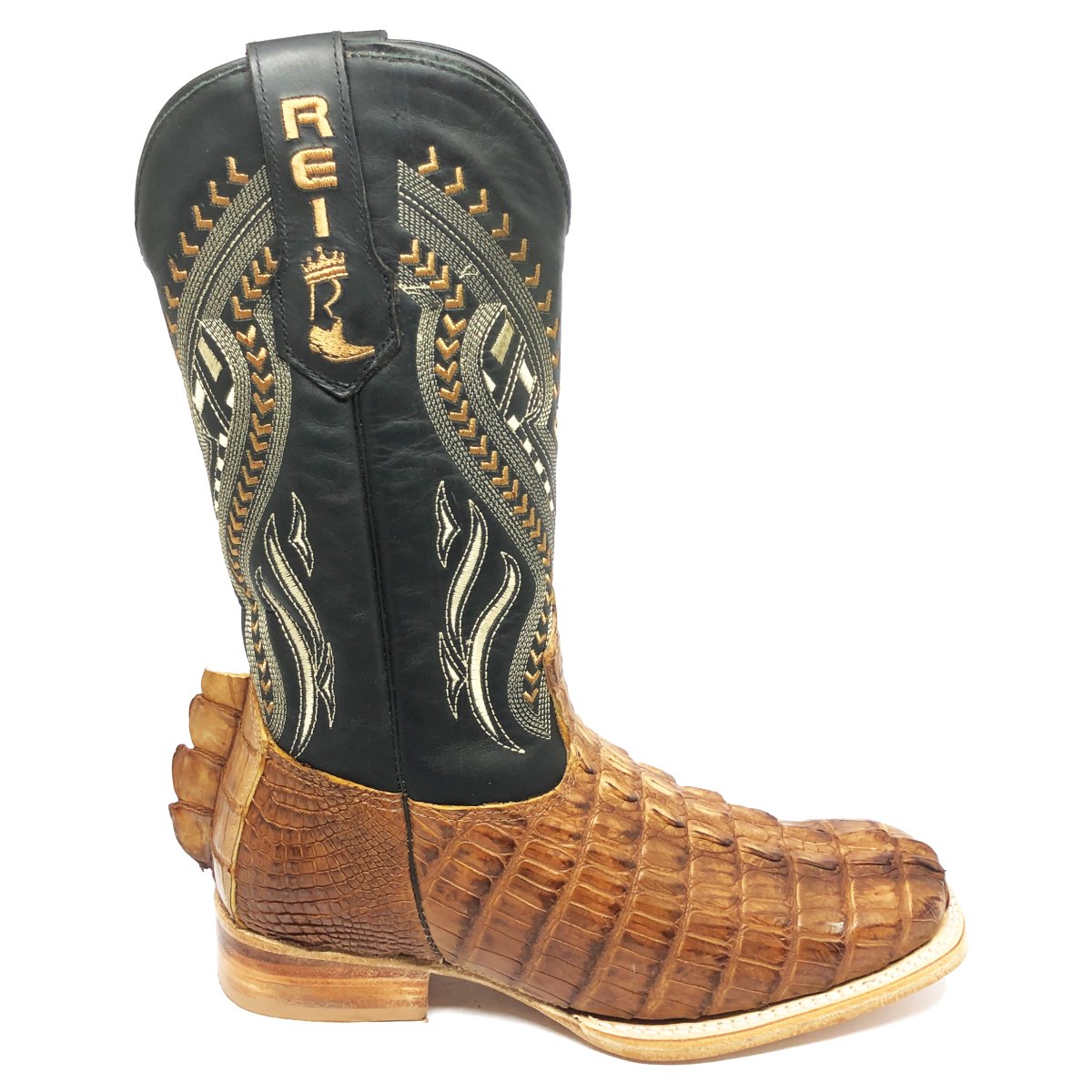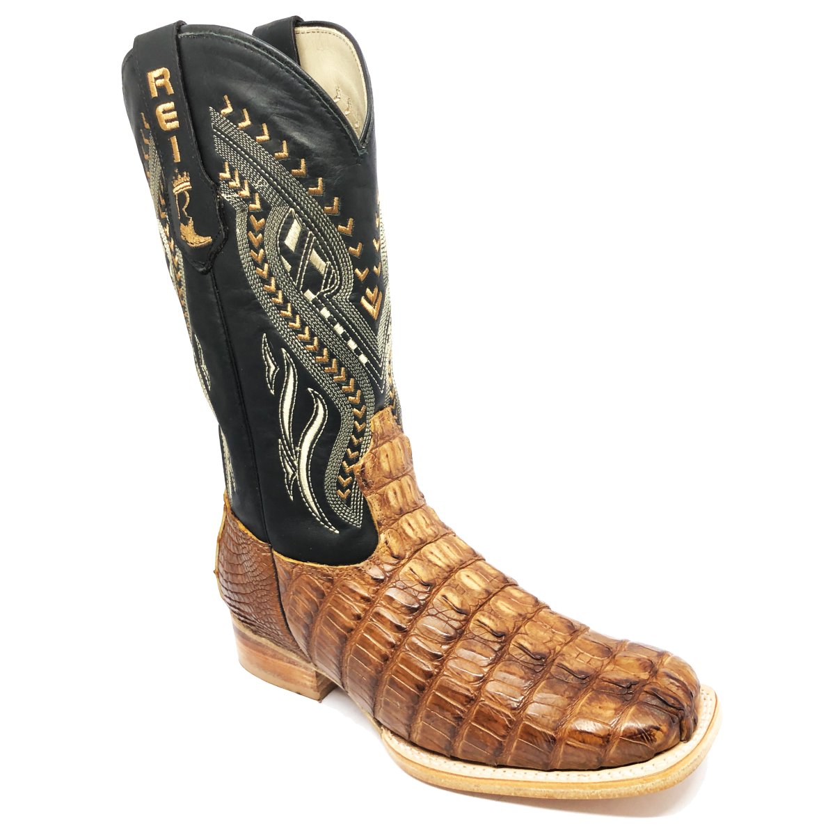 Bota Texana Reizinho Premium de Couro Legítimo de Jacaré Havana Rabo LIMITED EDITION - Cano Alto, Bico Quadrado - Solado de Couro Artesanal