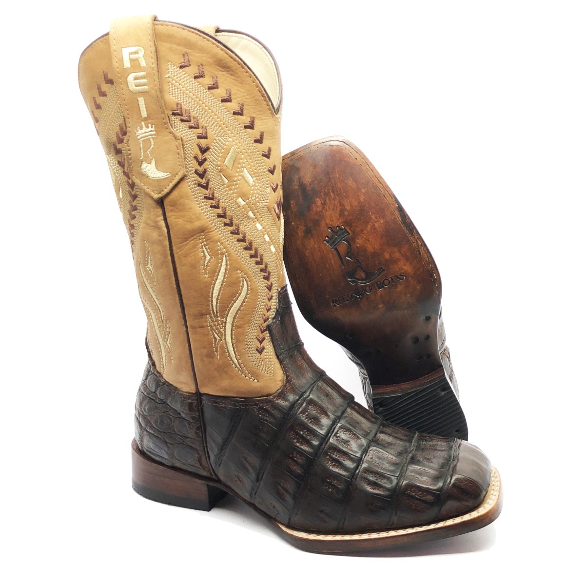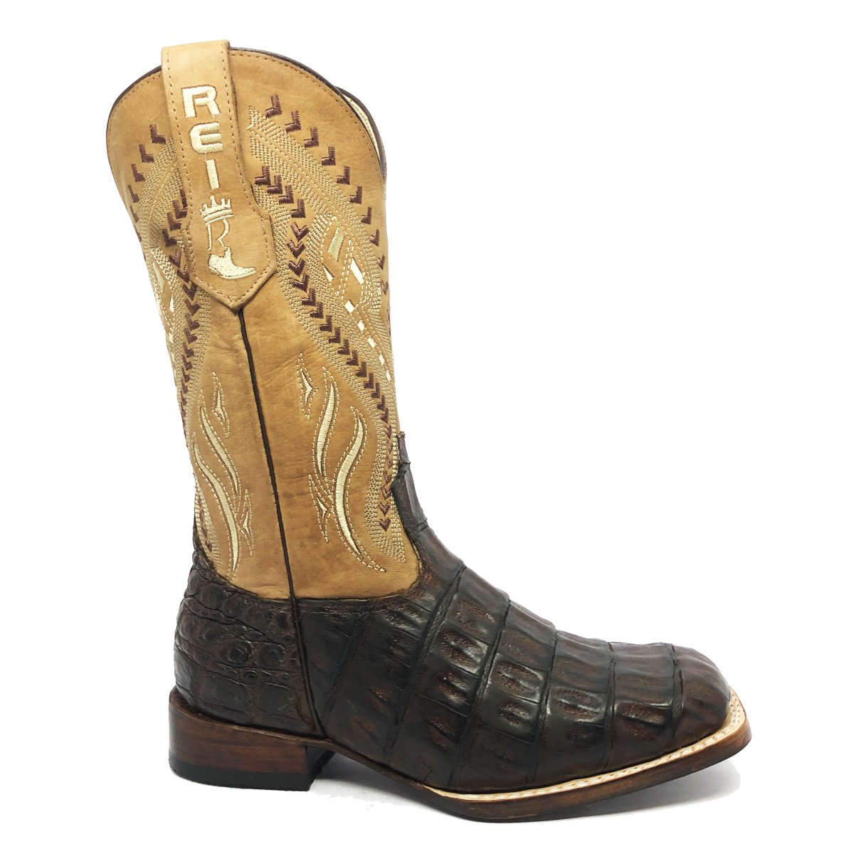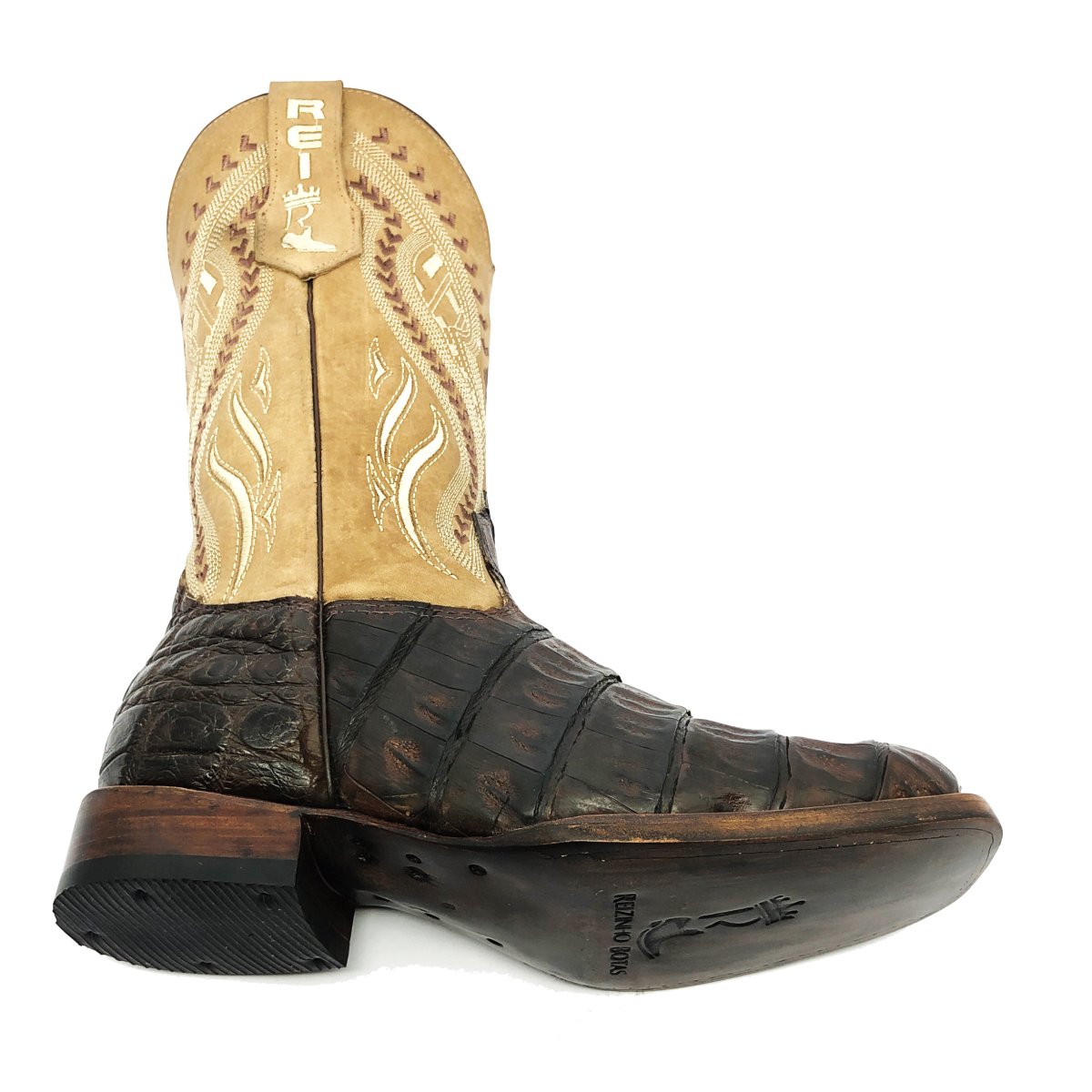 Bota Texana Reizinho Premium de Couro Legítimo de Jacaré Marrom LIMITED EDITION - Cano Alto, Bico Quadrado - Solado de Couro Artesanal