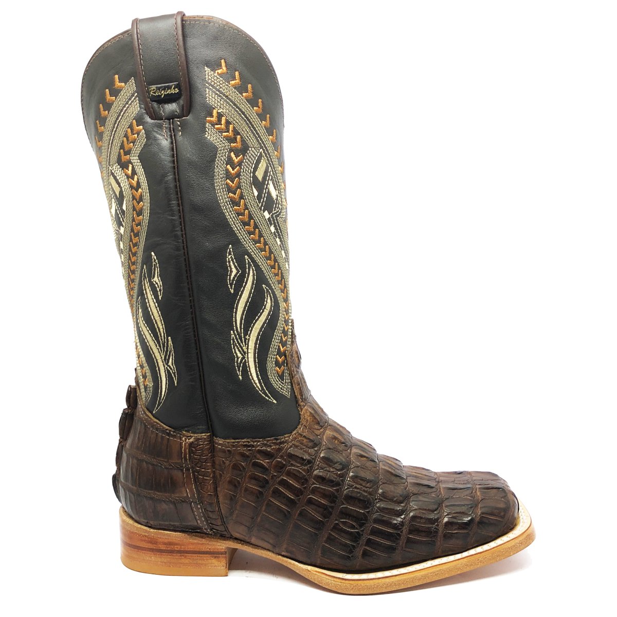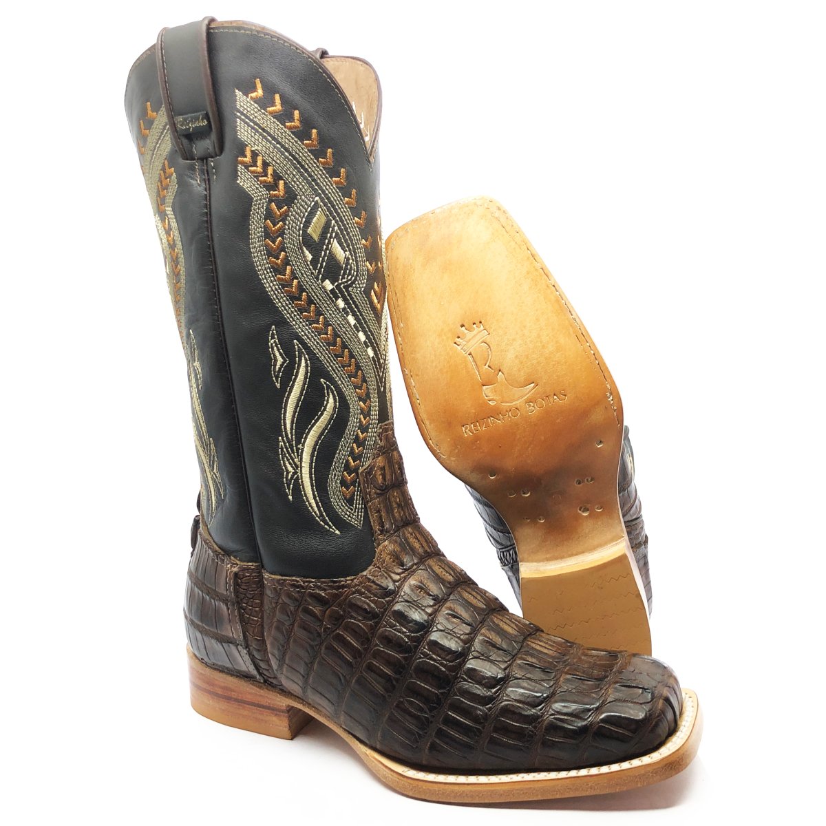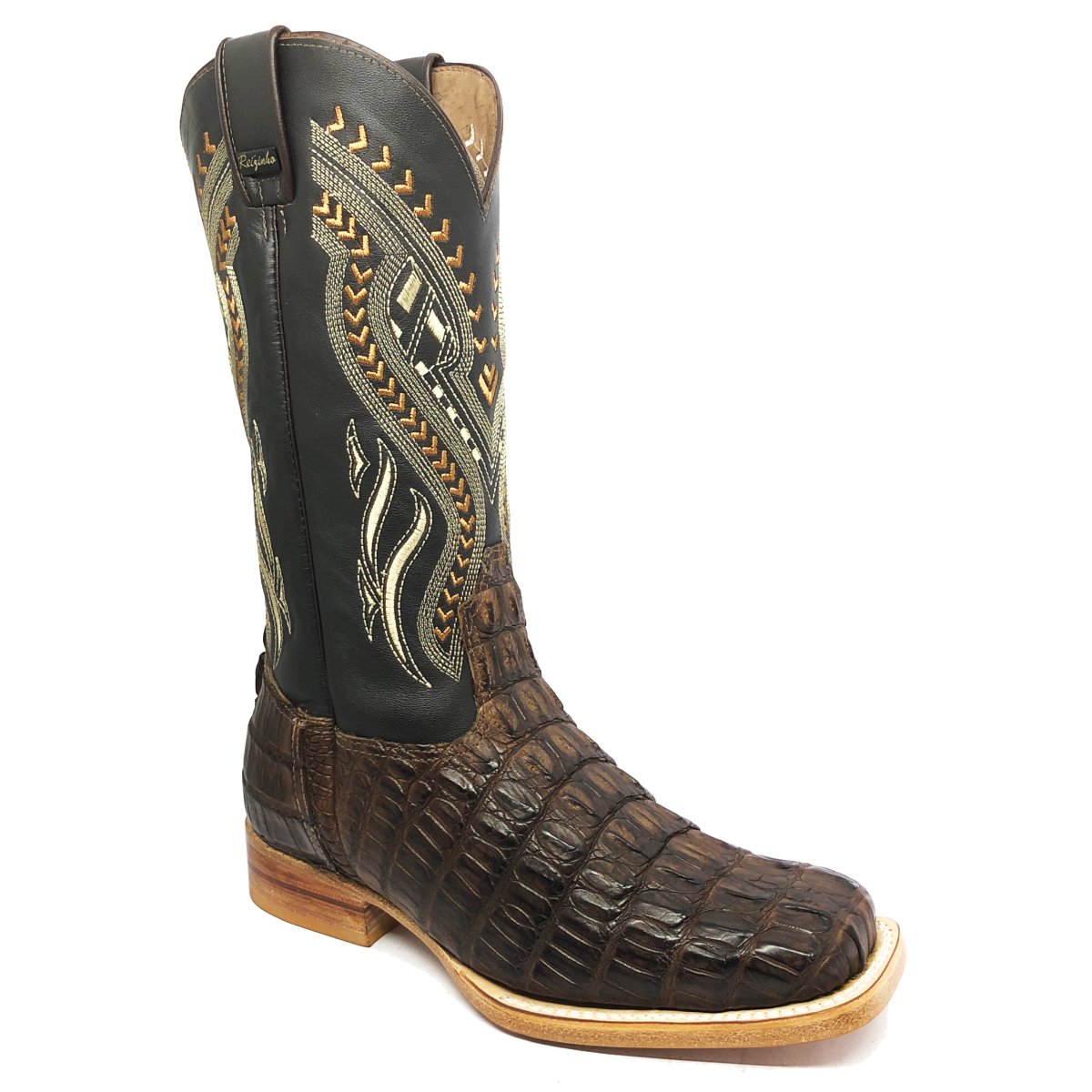 Bota Texana Reizinho Premium de Couro Legítimo de Jacaré Marrom Rabo LIMITED EDITION - Cano Alto, Bico Quadrado - Solado de Couro Artesanal