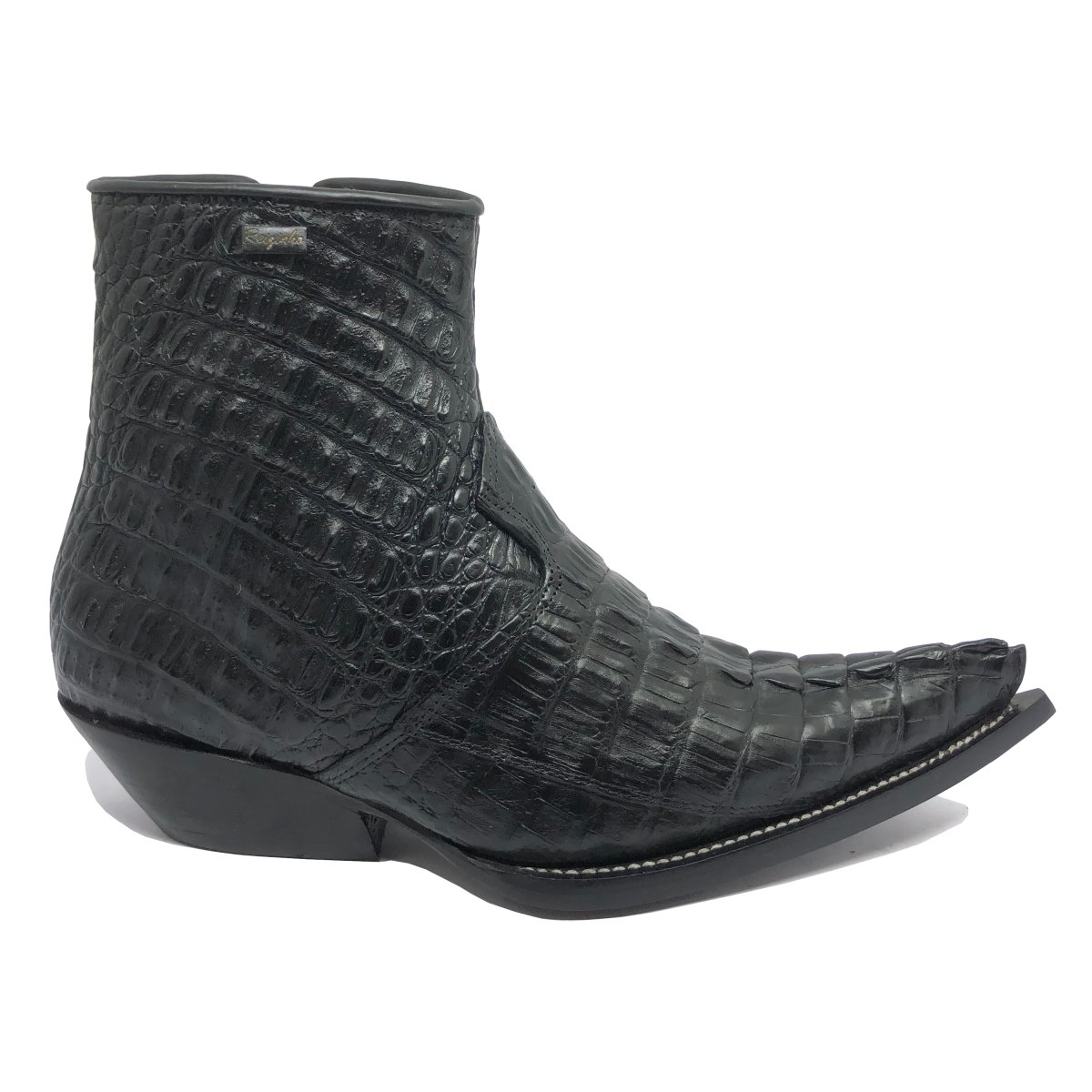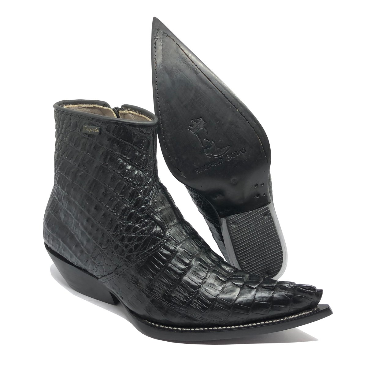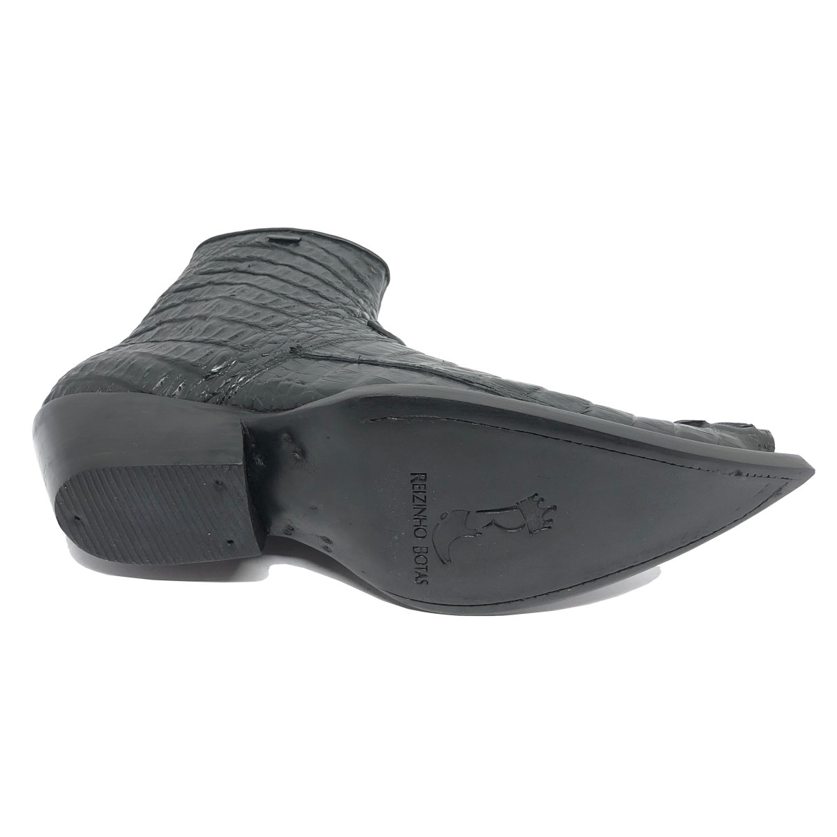 Bota Texana Reizinho Premium de Couro Legítimo de Jacaré Preto Rabo LIMITED EDITION - Cano Curto, Bico Fino - Solado de Couro Artesanal