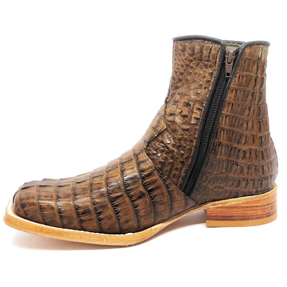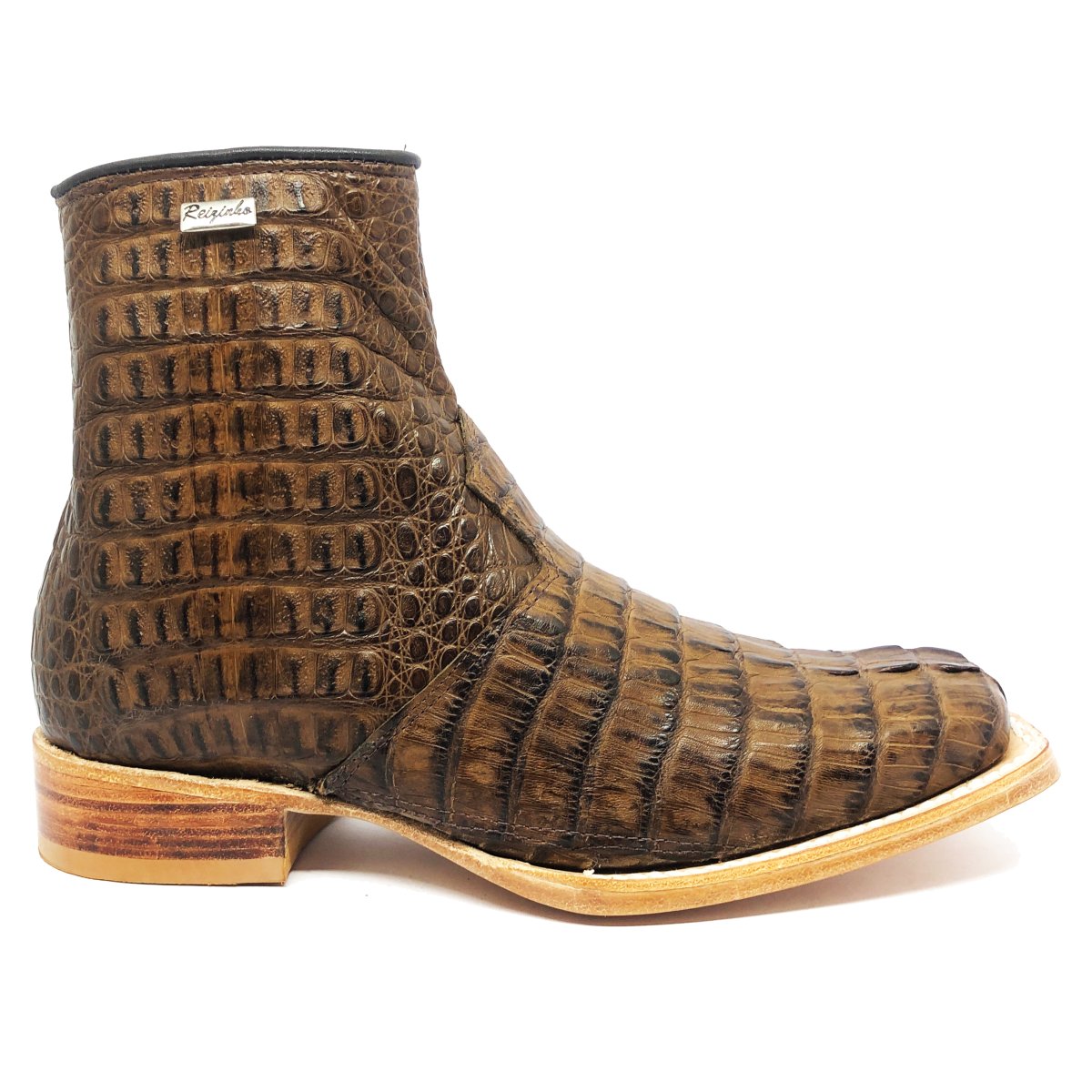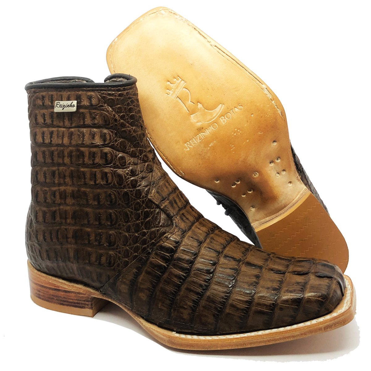 Bota Texana Reizinho Premium de Couro Legítimo de Jacaré Tabaco Rabo LIMITED EDITION - Cano Curto, Bico Quadrado - Solado de Couro Artesanal