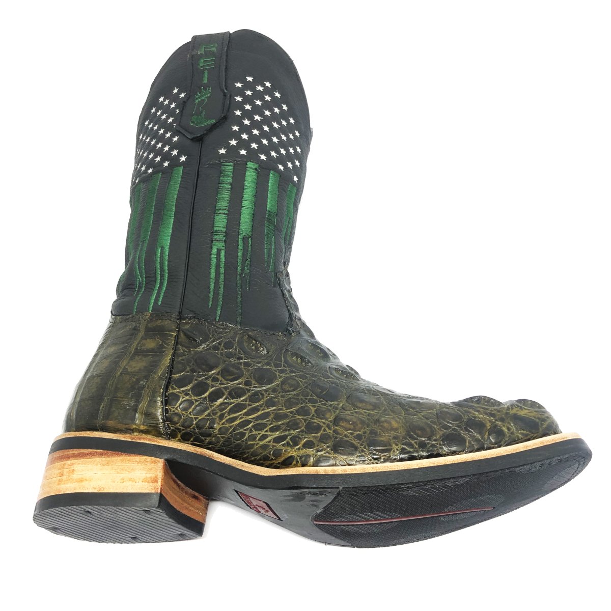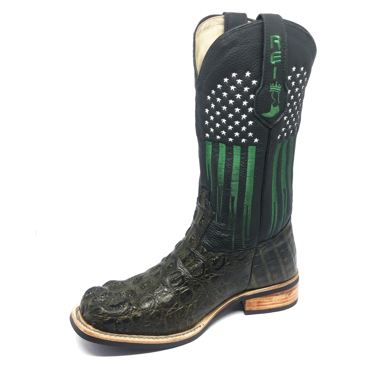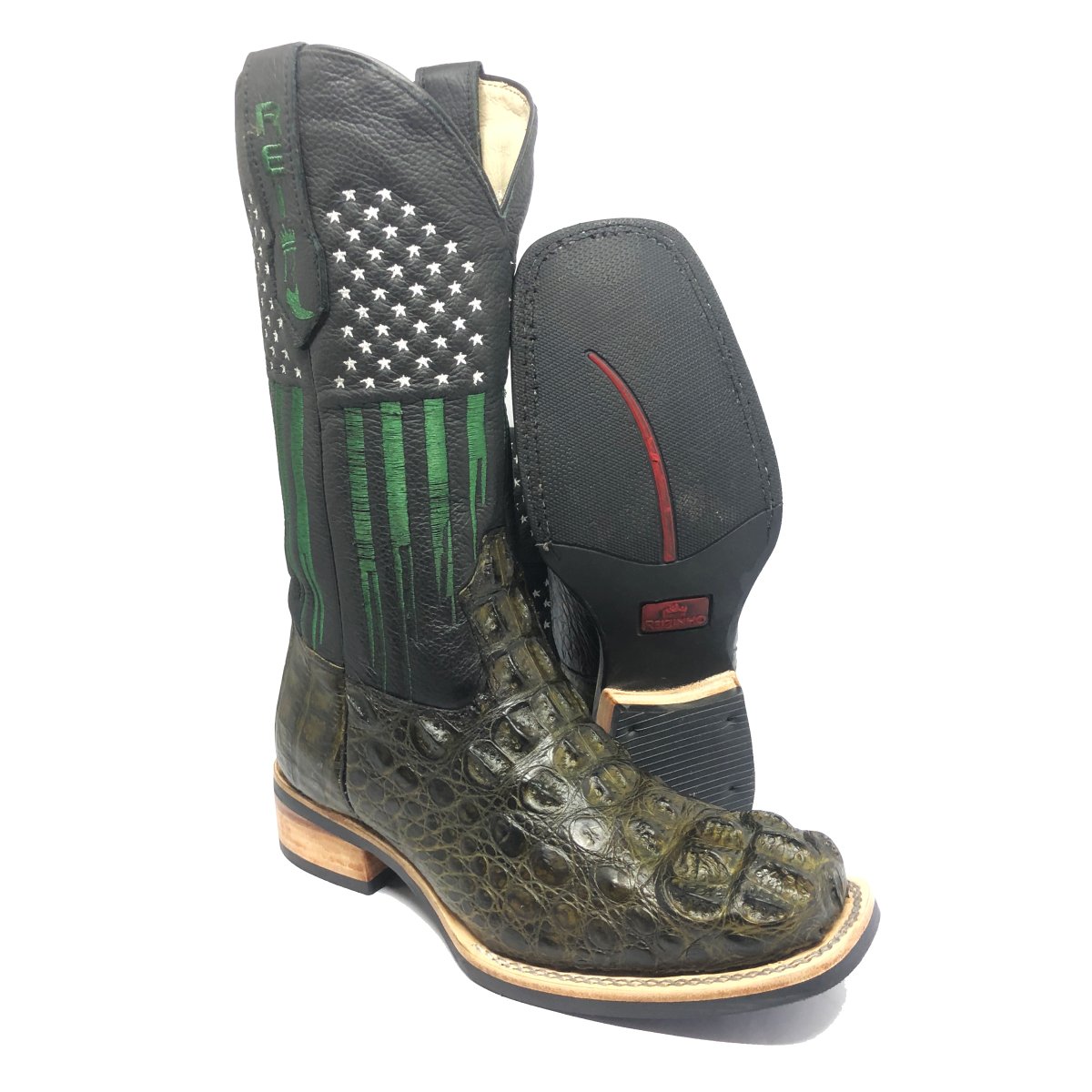 Bota Texana Reizinho Premium de Couro Legítimo de Jacaré Verde Musgo LIMITED EDITION - Cano Alto, Bico Quadrado - Solado X-Flex Artesanal